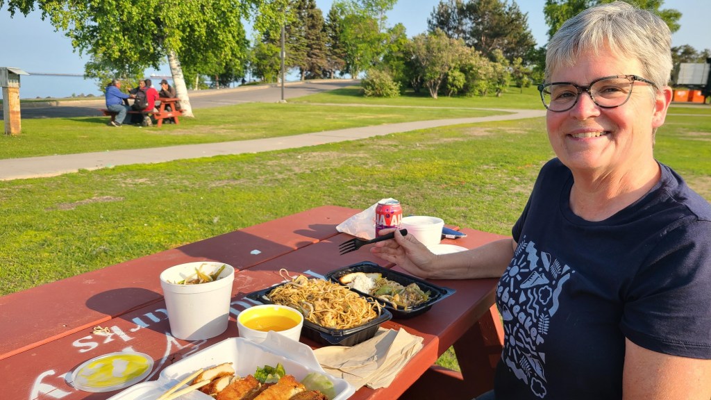 Before heading to Lottit Lake we went in search of Chinese food. Plan A-we went to the Fort William Curling Club as Google showed the restaurant as open. Well it wasn’t. Darn. Plan B-we found Ling Lee’s. Chop Suey Nation profiles Ling Lee’s – the restaurant was in the Port Arthur Curling Club until recently. Ling Lee started the restaurant and his daughter Norina Karschti took it over when Ling Lee passed away. During Covid, Ling Lee’s moved out of the Port Arthur curling club site and Norina integrated the take out Chinese food (same staff) with a fruit/chocolate/dessert business she ran with her daughter. This I knew from Laurel.