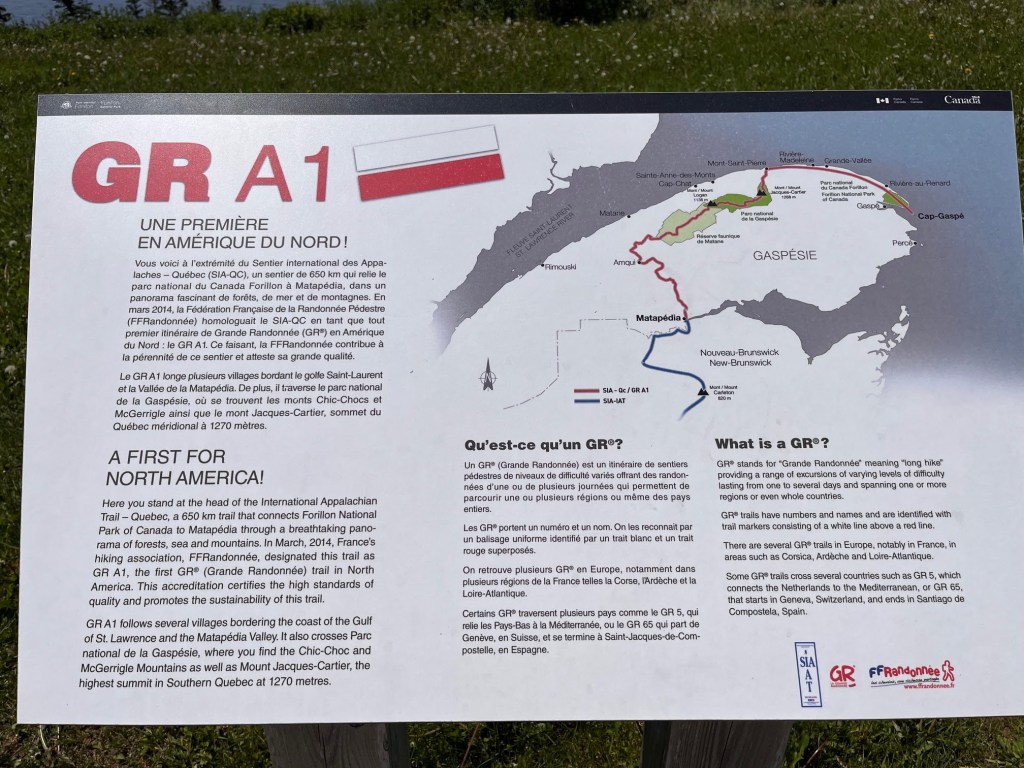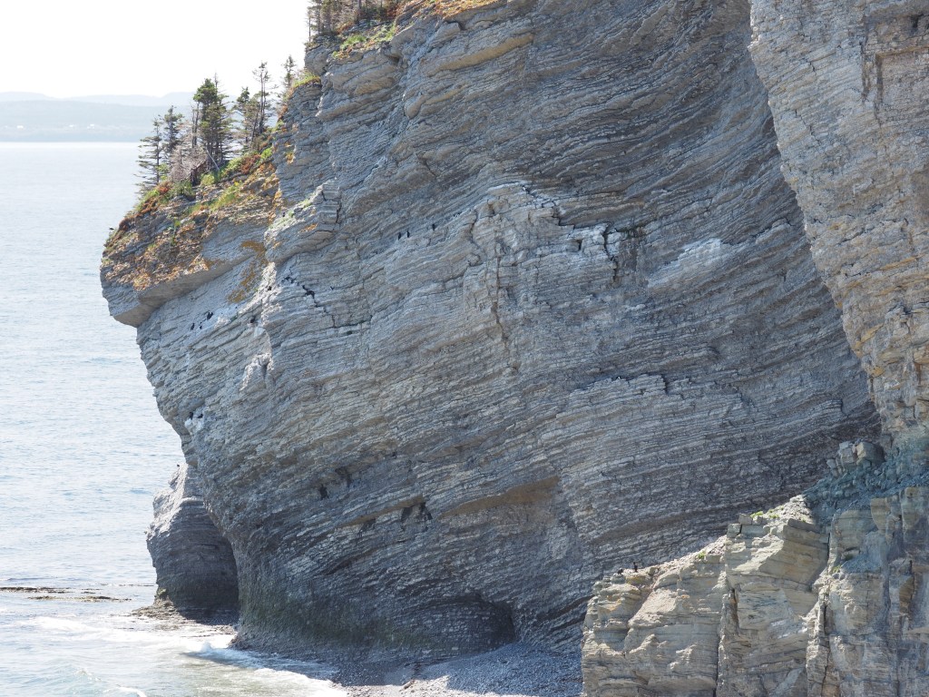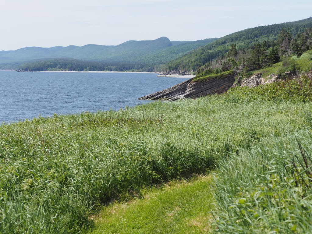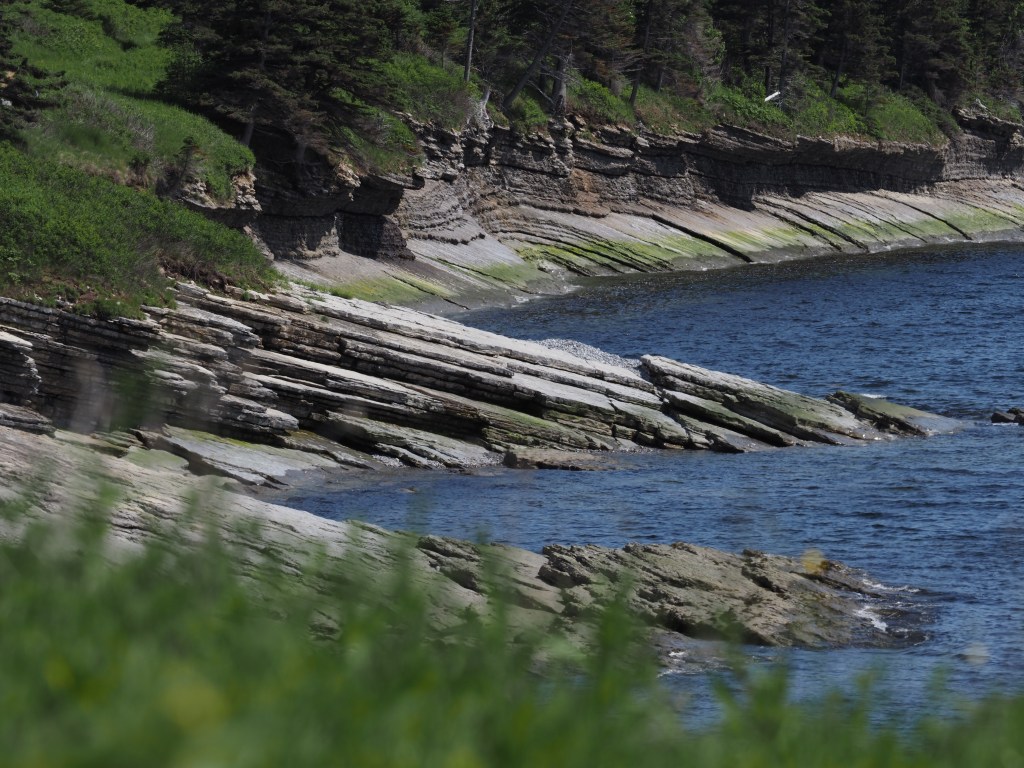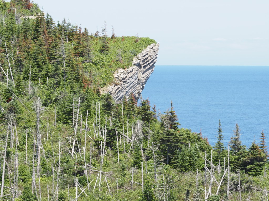And fueled on a lovely cod dinner and a great sleep, we had lots of energy for a 14 km hike to Lands End the next morning. Recall from the last blog post, Pat’s photos of the tip of the peninsula. It is too steep to access from the north side but on the south side there is a hiking trail that criss crosses a road/bike trail that takes you to the lighthouse at Cap Gaspe. Along the way there are interesting viewpoints.