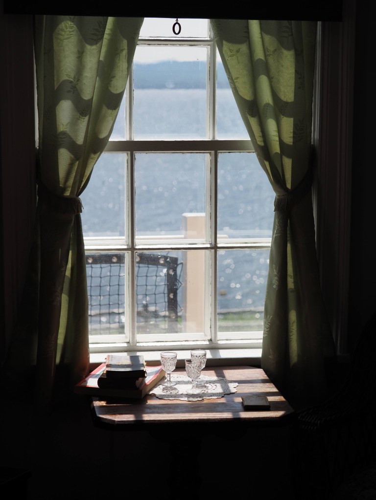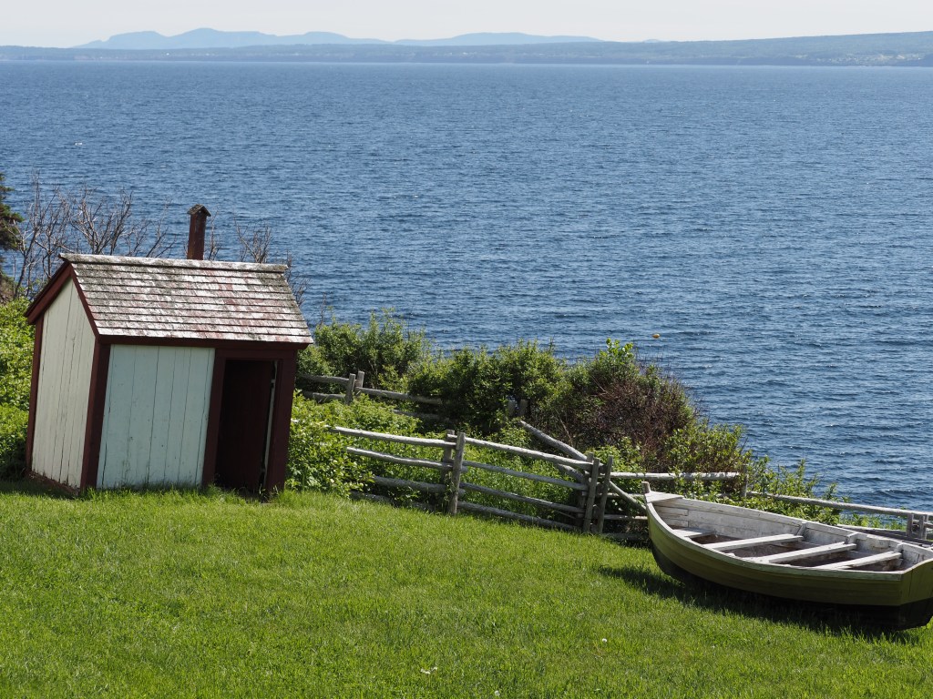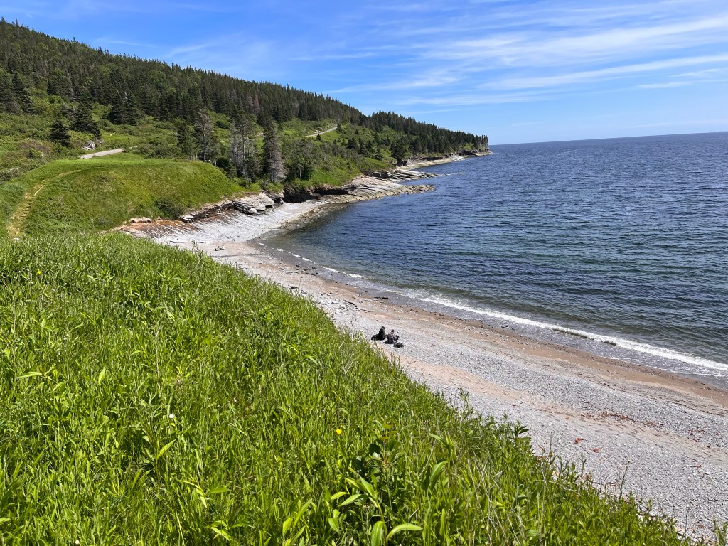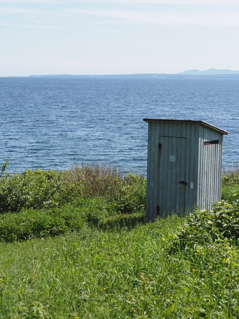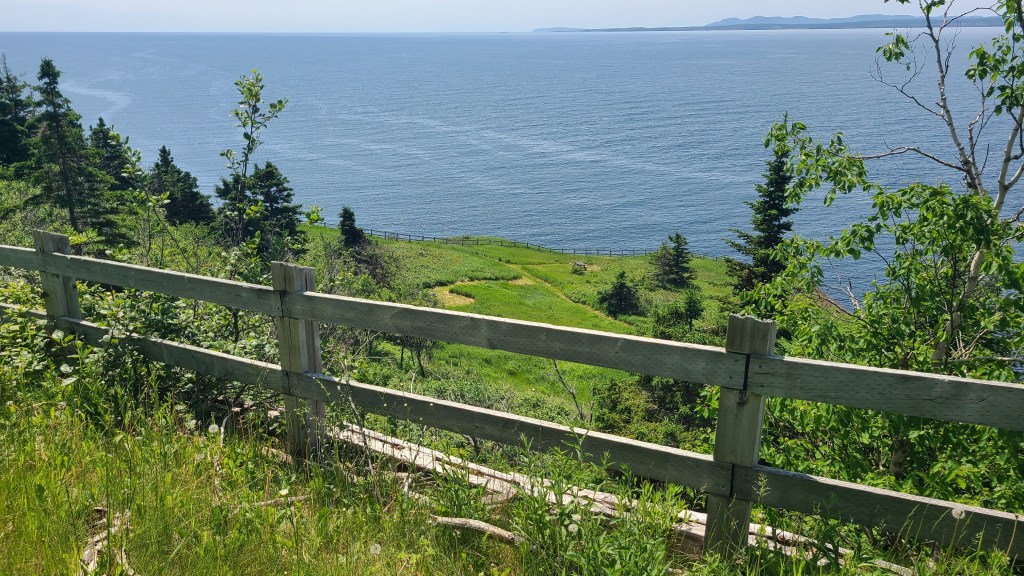 And fueled on a lovely cod dinner and a great sleep, we had lots of energy for a 14 km hike to Lands End the next morning. Recall from the last blog post, Pat’s photos of the tip of the peninsula. It is too steep to access from the north side but on the south side there is a hiking trail that criss crosses a road/bike trail that takes you to the lighthouse at Cap Gaspe. Along the way there are interesting viewpoints.
