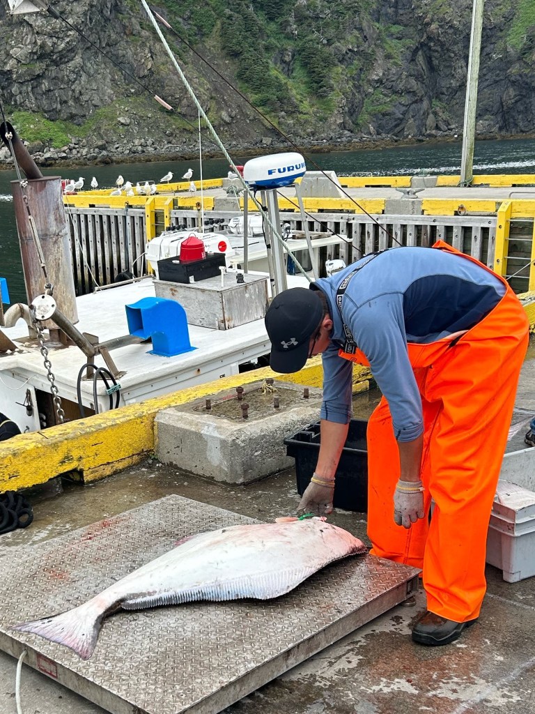 Back at the trailhead, Pat checks out the halibut fishing action at the nearby dock.