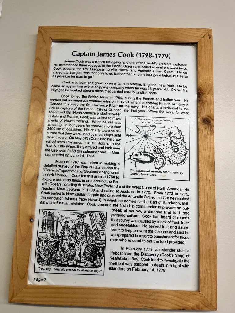 Speaking of James Cook – this fellow was everywhere. He mapped Nfld. Recently his map was compared to a recently updated version and the Nfld govt wondered why they spent the money on the update as Cook’s map was pretty darn accurate. Cook also explored the West Coast of North America, Hawaii and the South Pacific.