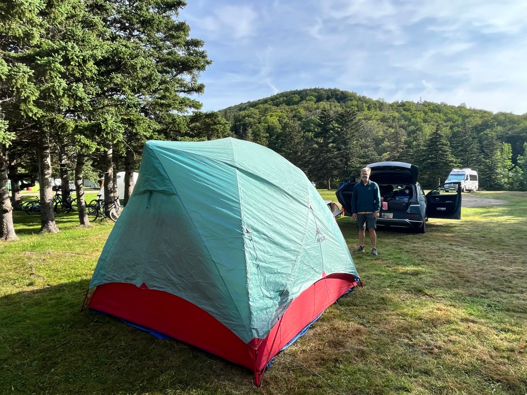 Our campsite at Cheticamp. Brilliantly, we are about 500 meters from an EV charger. Almost perfect; we didn’t request the little black flies that came with the campsite. Oh well.