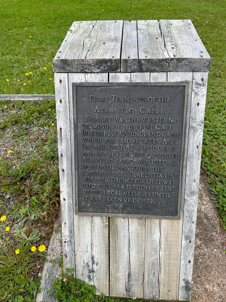 We find out one additional fun fact. Yet another plaque, this one dedicated to the first Cape Breton cable terminus of the Cape Breton-Newfoundland Cable. This cable connected communications to Port Aux Basques. This cable was laid in 1856.