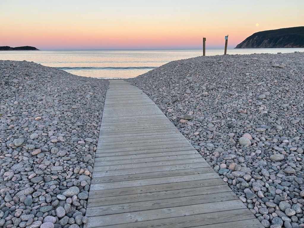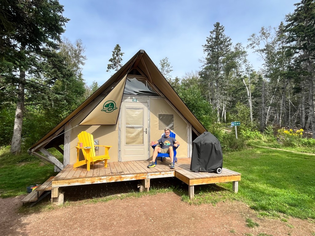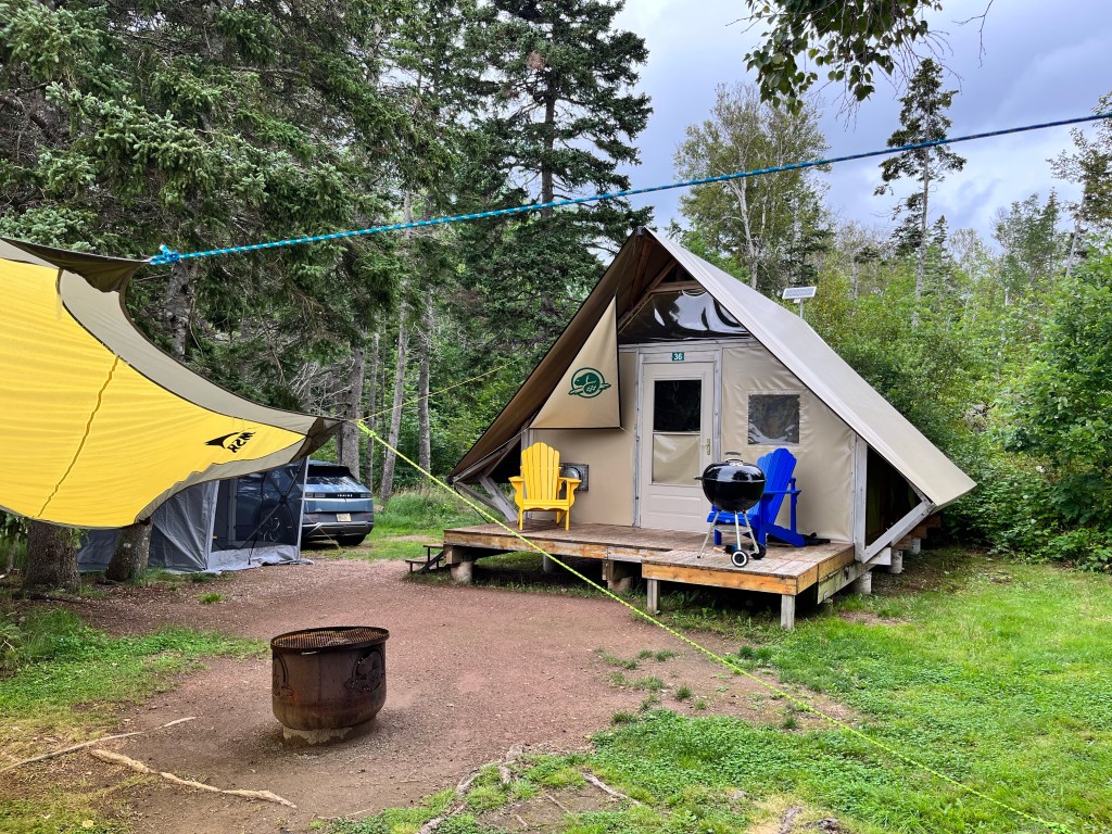 Not only can we see the beach, we can also see the EV chargers from our oTENTik. Wow! In the 5 prior national park visits on our trip, park EV chargers are no where near the campgrounds. (Kuddos – there are at least two other park EV chargers in Cape Breton Highlands NP paired up to two campgrounds.) We do not suffer range anxiety. These are not fast chargers but for overnight charging these chargers are perfect. We leave Ingonish on a full charge 😉