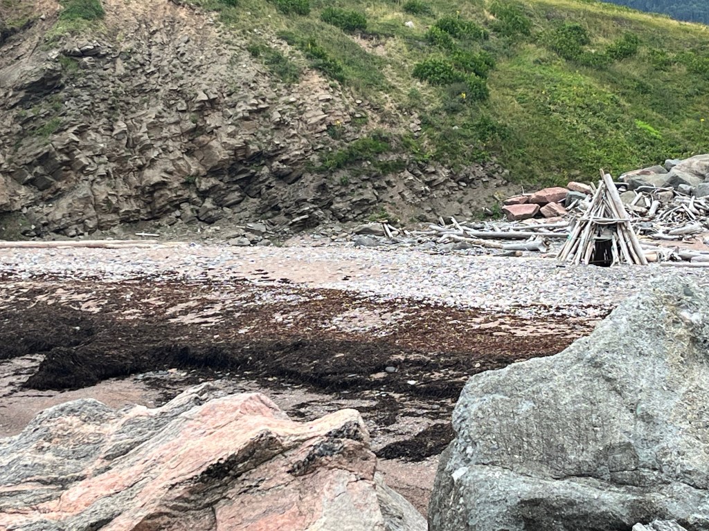 There is another couple at the beach – maybe you can make them out in the distance. We meet up. Their plans this day are a whale watching trip that has just been cancelled and they are considering the drive to Meat Cove but mention about the road. They head off!