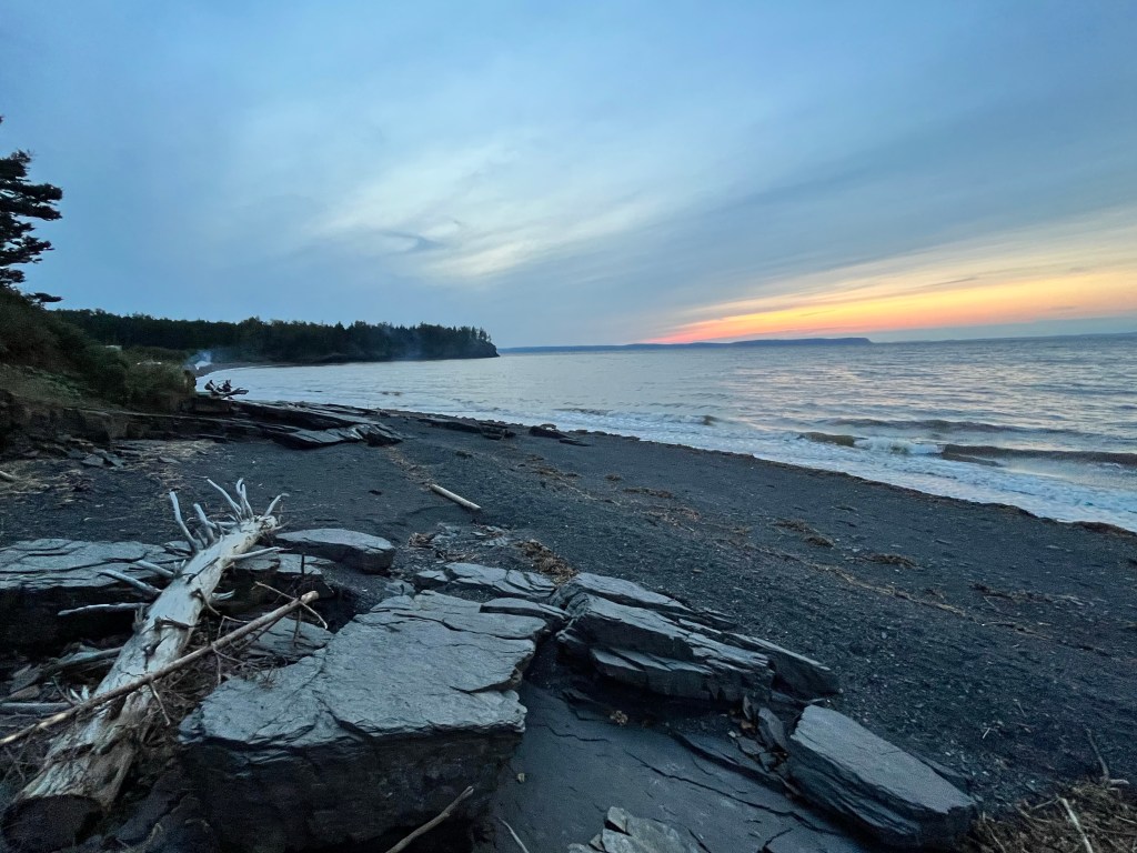 Way back at Blow Me Down, Newfoundland we met Jenna and she spoke highly of Mutton Cove. We arrive at dusk. We meet a couple that are beach camping and enjoying a cozy campfire. Another place we add to our ‘for next trip’ list.