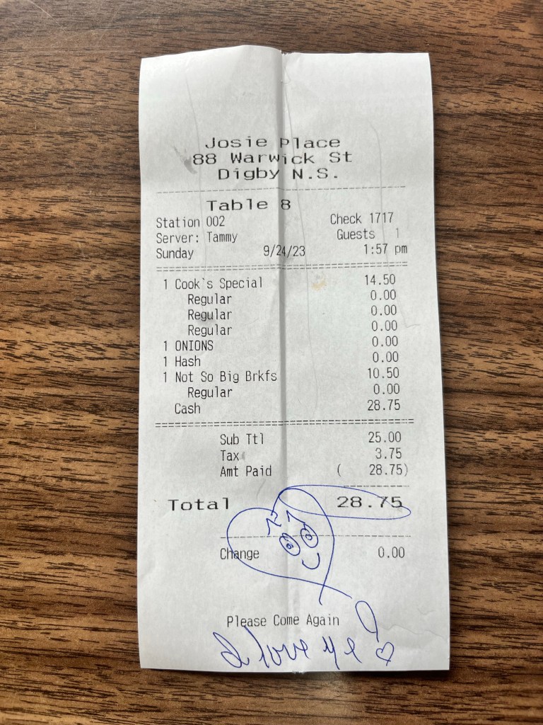 Charging turns out to be a challenge. Bridgetown is midway between fast chargers at Wolfville and Digby. A bit inconvenient but we make it work. We head to Digby – we get breakfast at Josie’s Place while the car charges.