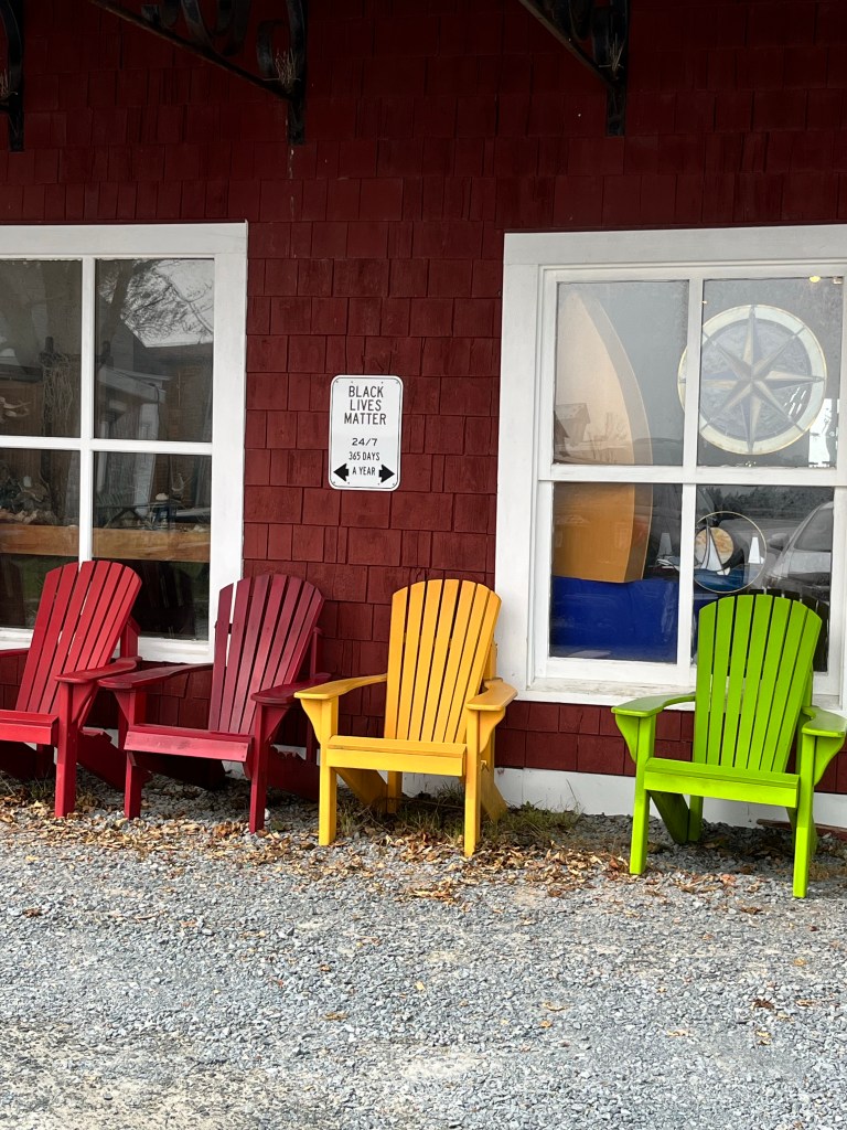 We settle into those colourful Adirondack chairs outside with our sandwiches and coffee.