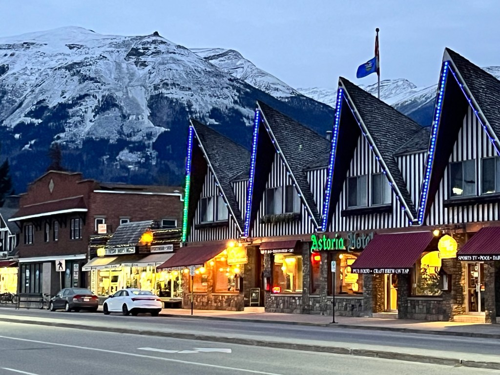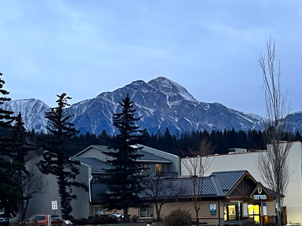 The stop in Jasper is the longest of the trip-three hours-from about 6am to 9am. The coffee places and gift shops are open for the travellers. Even in the wee hours Jasper is spectacular.