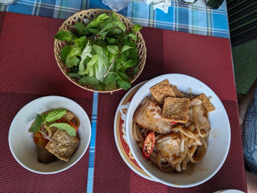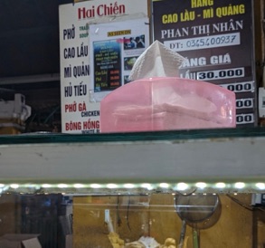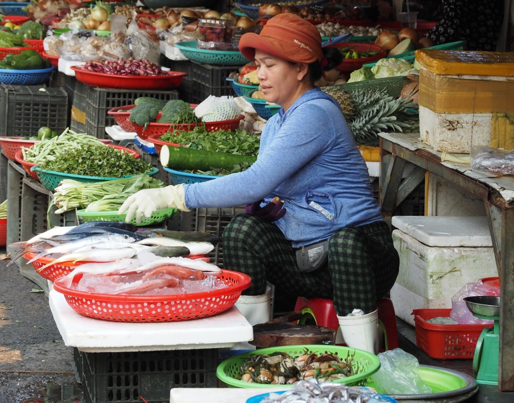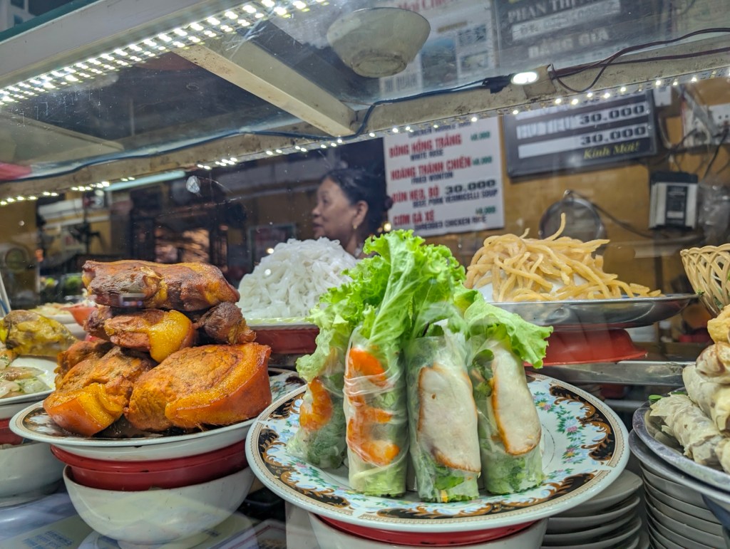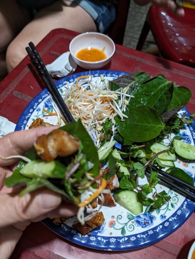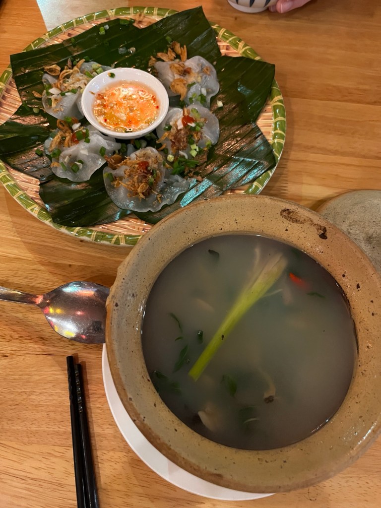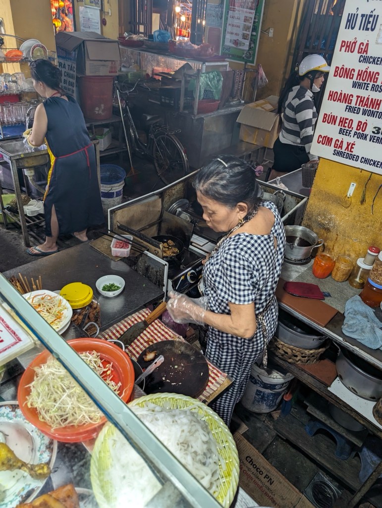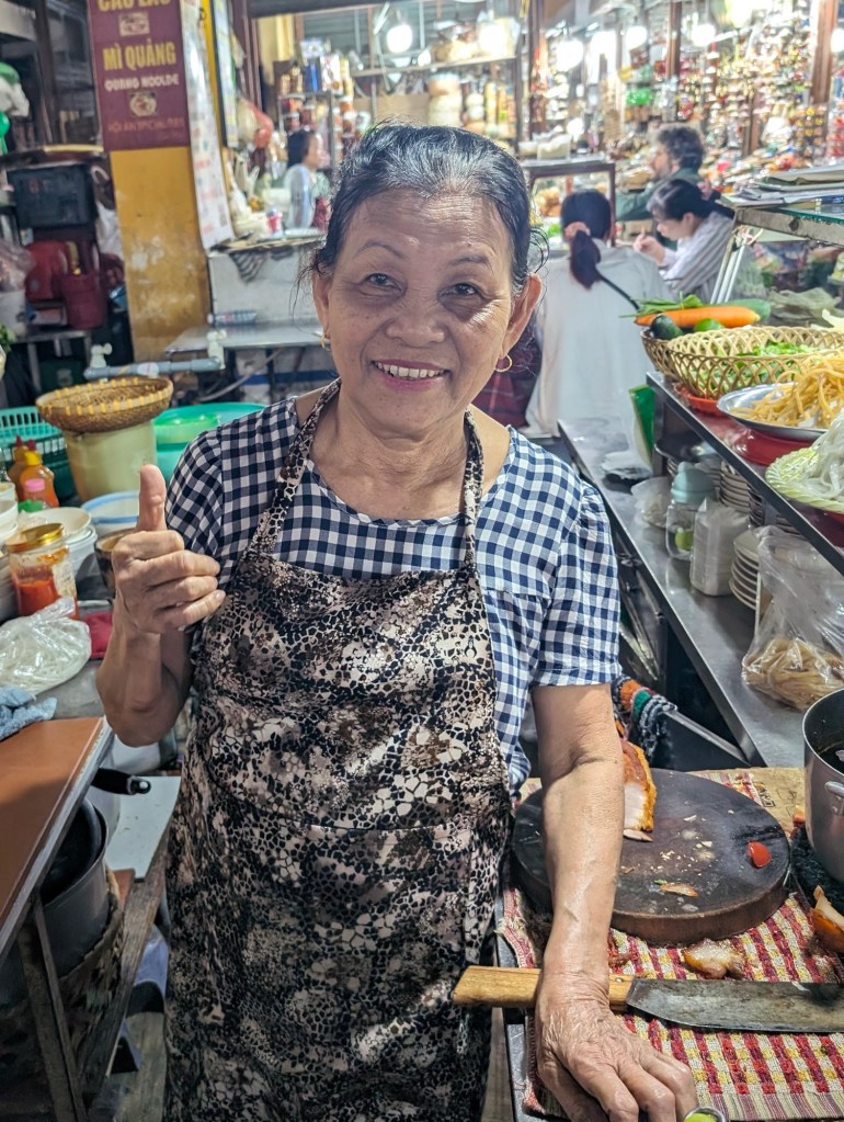 We are hungry. Pat remembers that Anthony Bourdain visited / ate at Hoi An’s market. We wander into the very center of this large market where the food stalls are located. It is nothing fancy. We ask around about the lady chef who had a visit from Tony. Everyone points —>