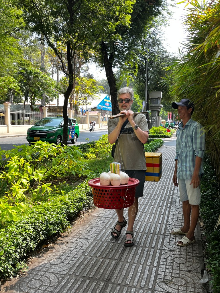 After the Art Gallery, we walked to the War Remnants Museum. Along the way we met a street vendor who was interested to see how I would do carrying his wares. It was heavy! But I think I did OK.