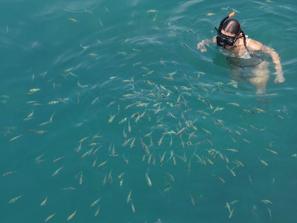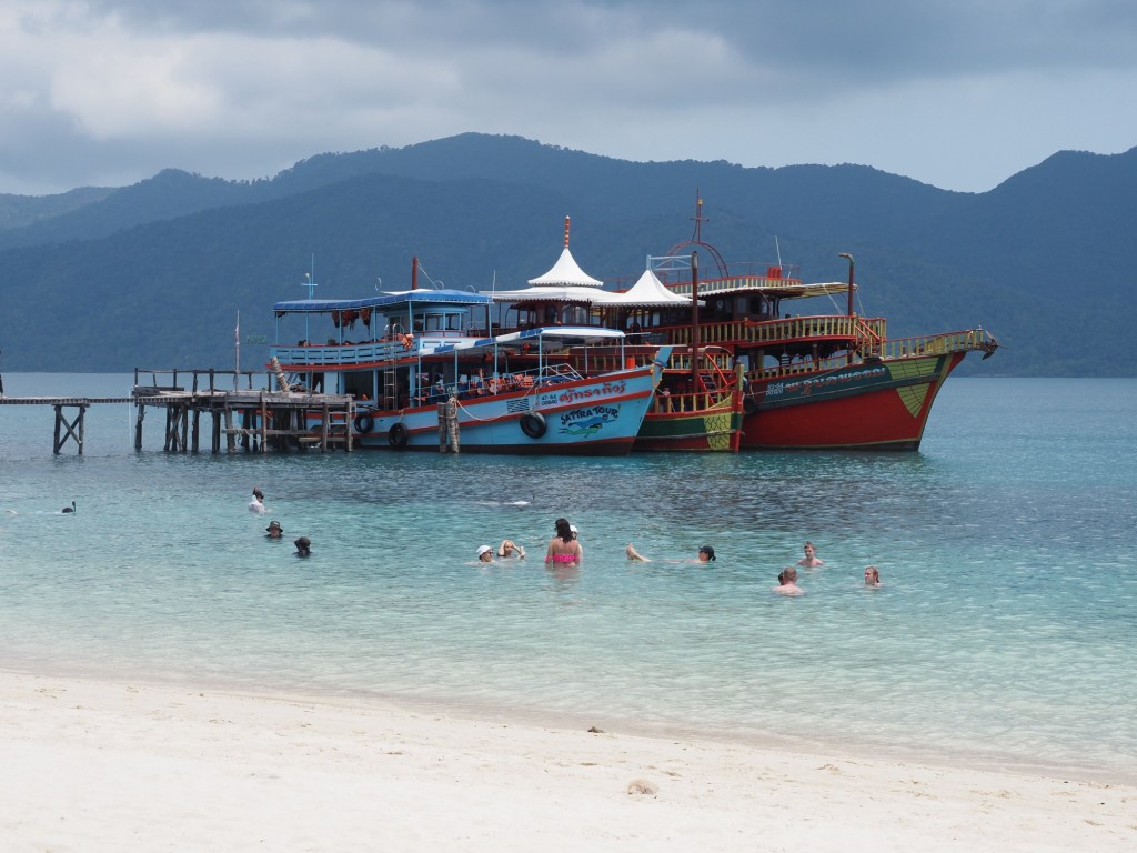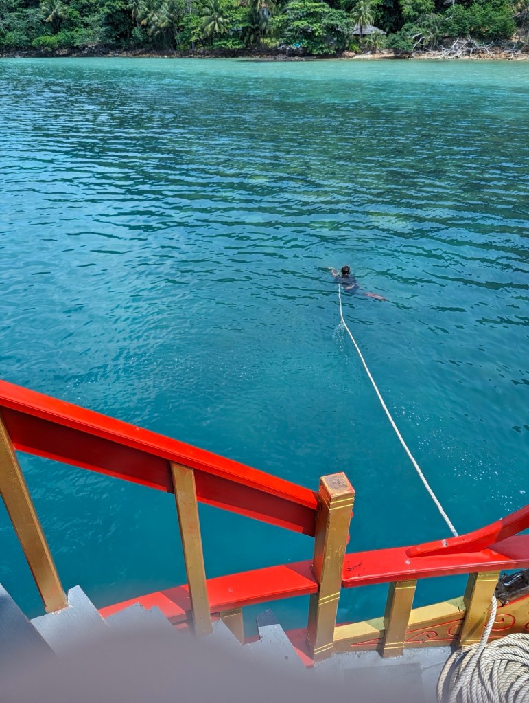Our second stop is Koh Wai. The boat moors – a staff member dives in with the rope and finds the buoy. The snorkeling is better here.