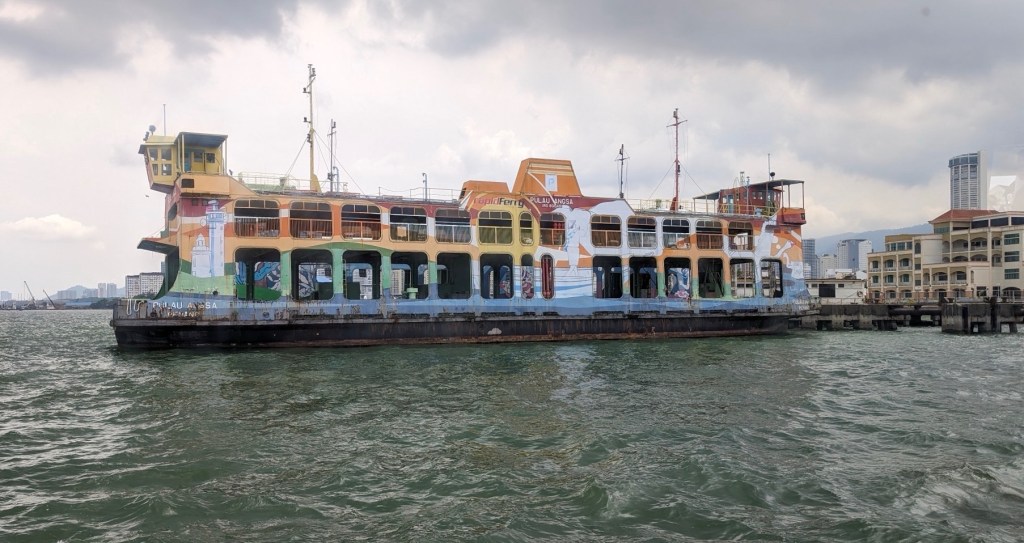 We buy tickets in advance at the rail station across the harbour on the mainland side in Butterworth. We Grab one way, get 🎫 and take the harbour ferry back to George Town. The ferry is similar to taking Vancouver’s SeaBus except motorcycles are allowed. The waiting room provides the ferry crossing history – first car ferry etc. and there are plans to repurpose the recently retired ferries.