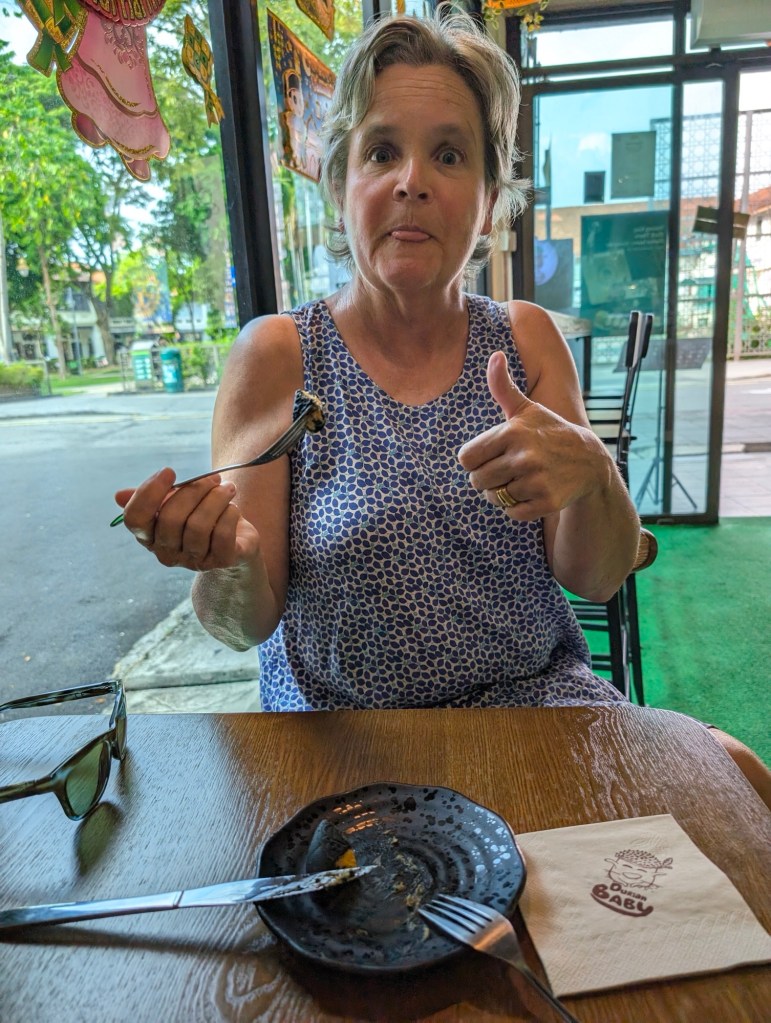 We have a lovely ‘nyonya’ meal. Tina’s mom works the few tables and Tina is cheffing in the kitchen. It is a small restaurant – just the two ladies. The eclectic decor reminds us of Chinatown restaurants in Vancouver. Tina’s menu is full of the dishes she grew up with (and her mom taught her how to prepare). We want to order the whole menu but settle for pork lorbak (bbq) and fried eggplant and rice. We chat with Tina when she takes a break.