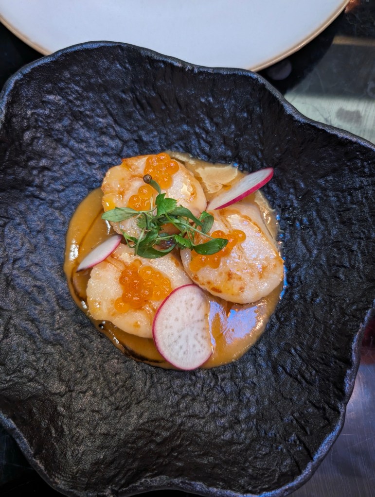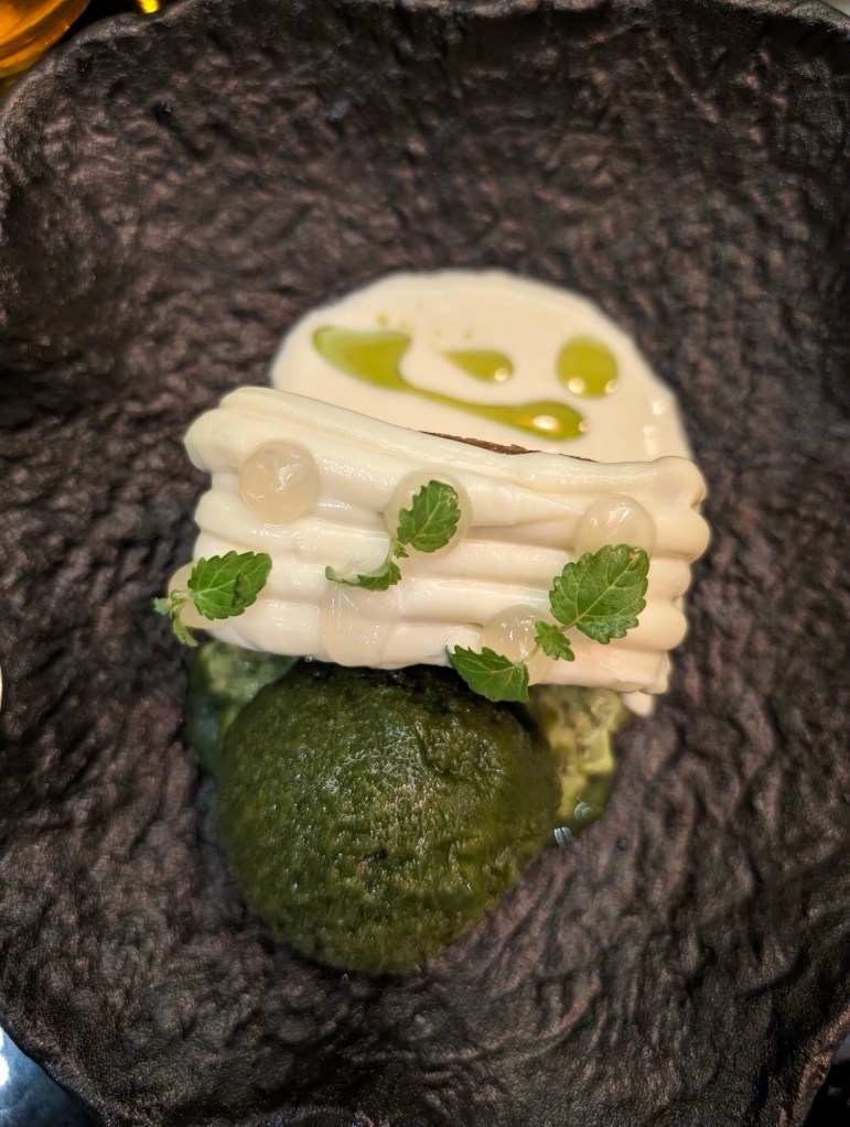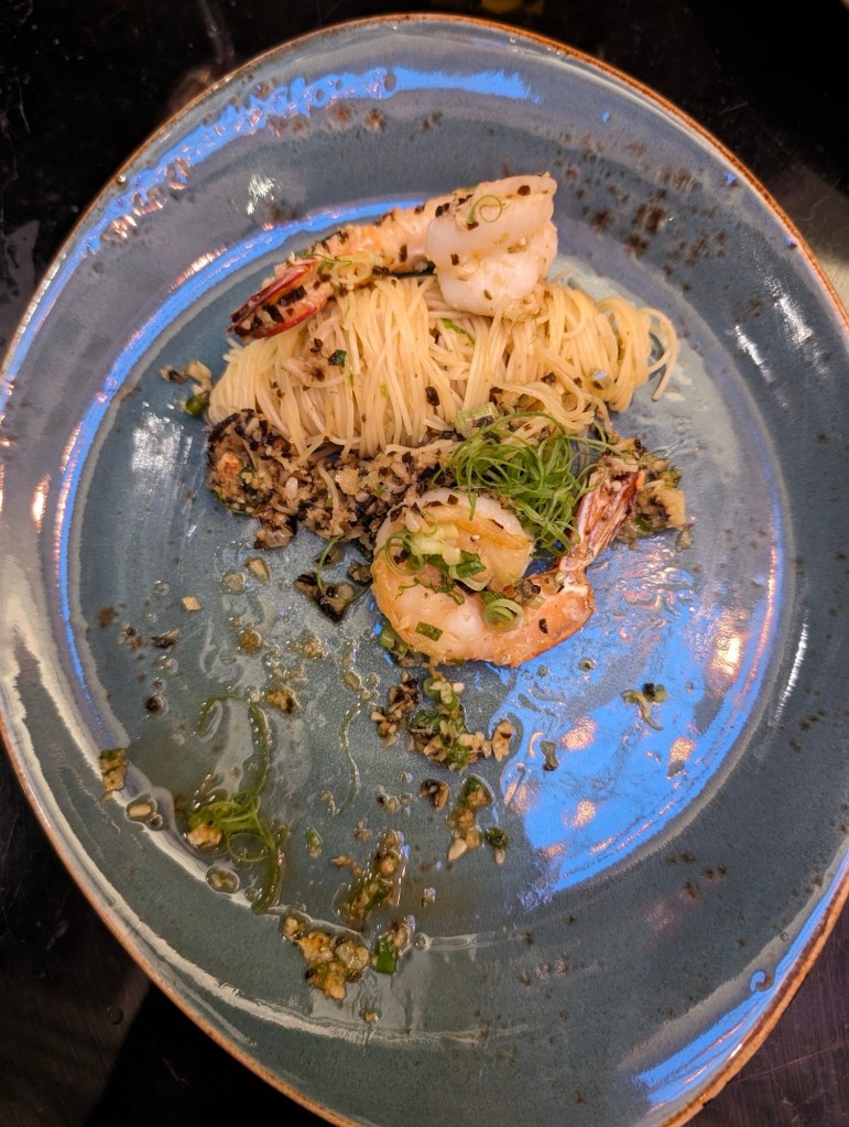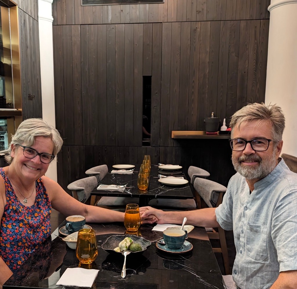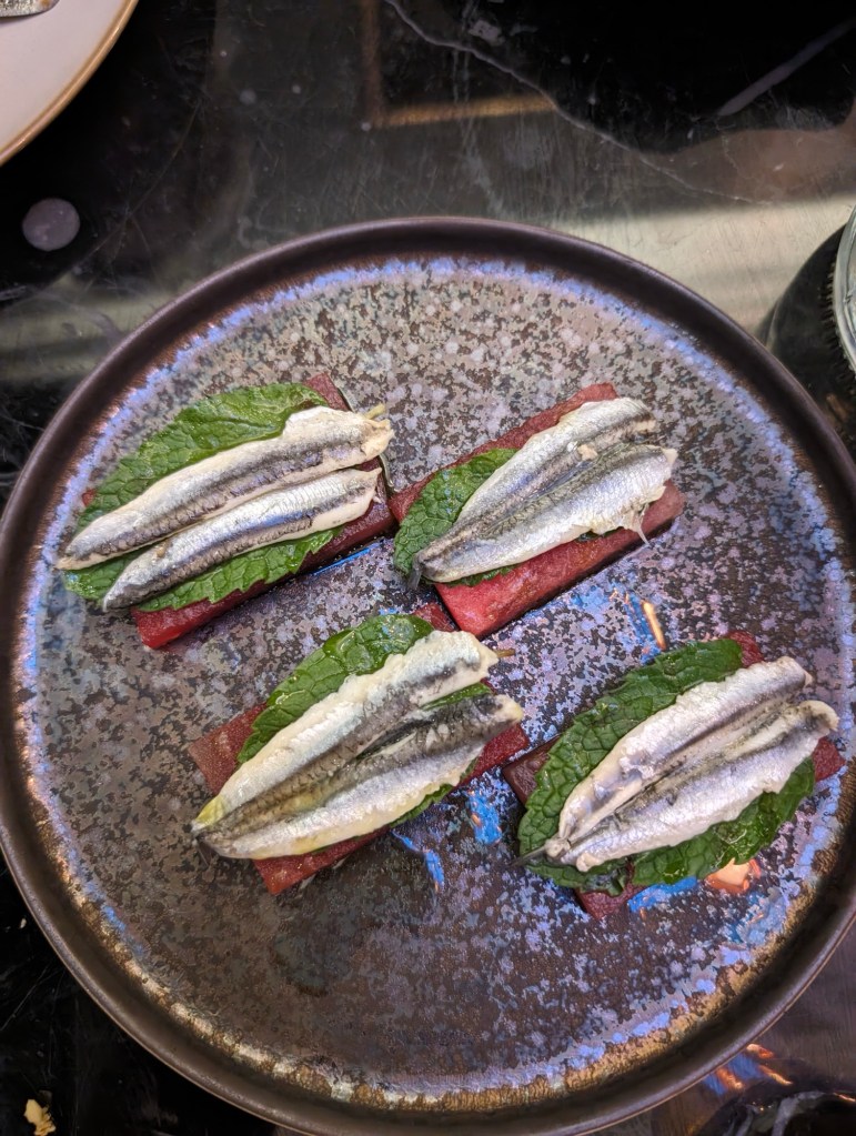 The restaurant is beautiful and our meal is terrific. We have scallops, anchovies with watermelon and a pesto, prawns, and a panna cotta dessert. A surprise at the end, ice cream with our coffee.