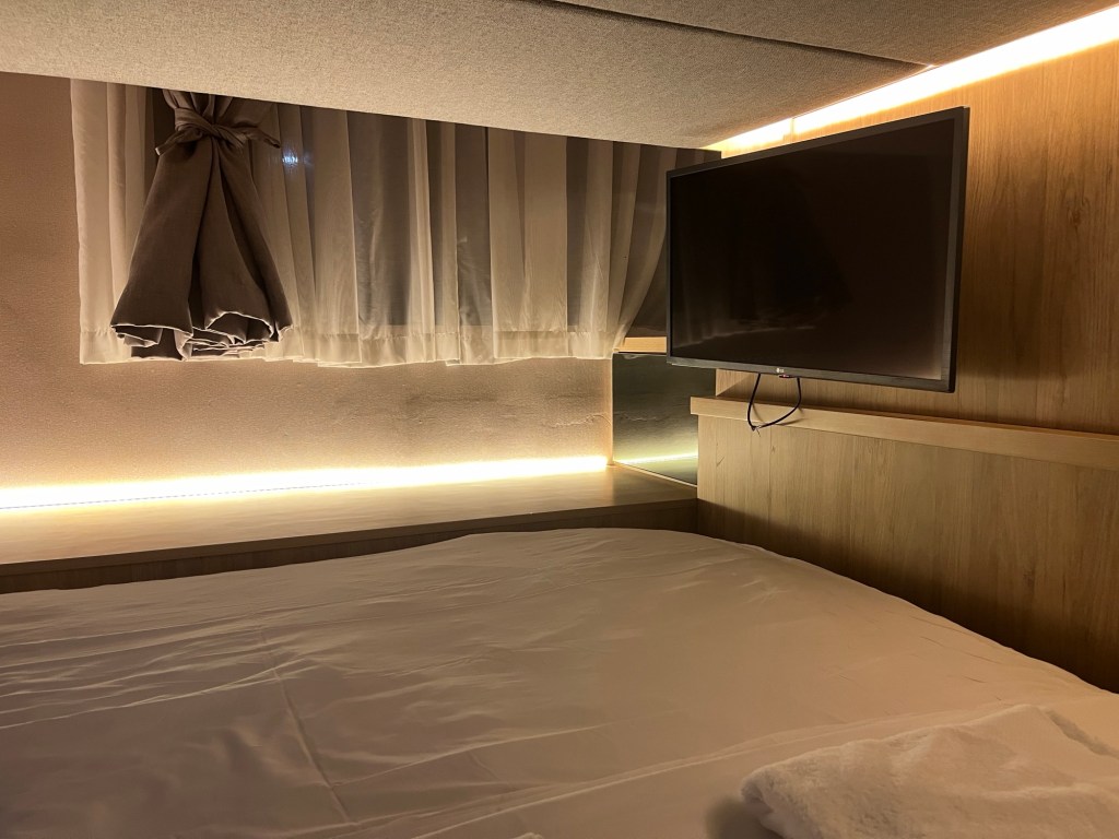 This is a premium cabin – with a bathroom and window. The bathroom is very efficient. The window has the benefit of a wide ledge where I stash my main bag. The room size is 8m2.