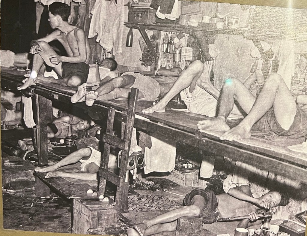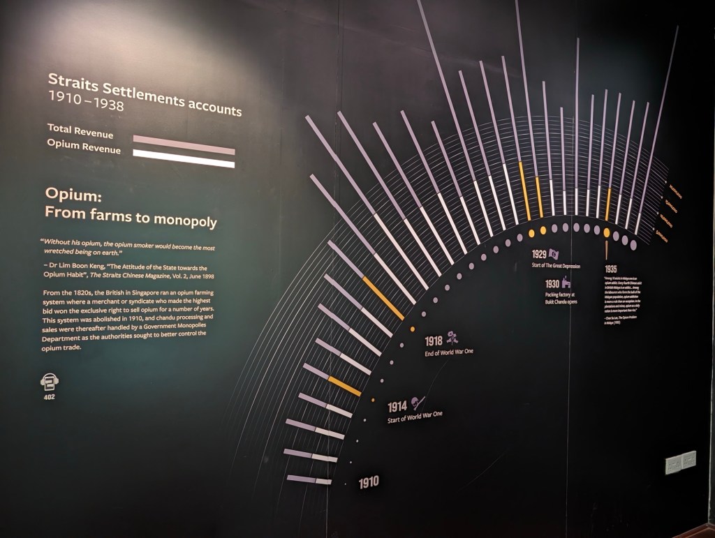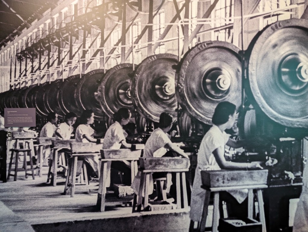We learn about the opium trade. It gets started in the 1800s. In 1910 opium accounts for nearly half the revenue from Singapore, Malacca and Penang (the major ports controlled by the British). Who knew! This farm crop is regulated, taxed and is a dominant govt revenue source into the 1920s. The harm it causes is acknowledged.