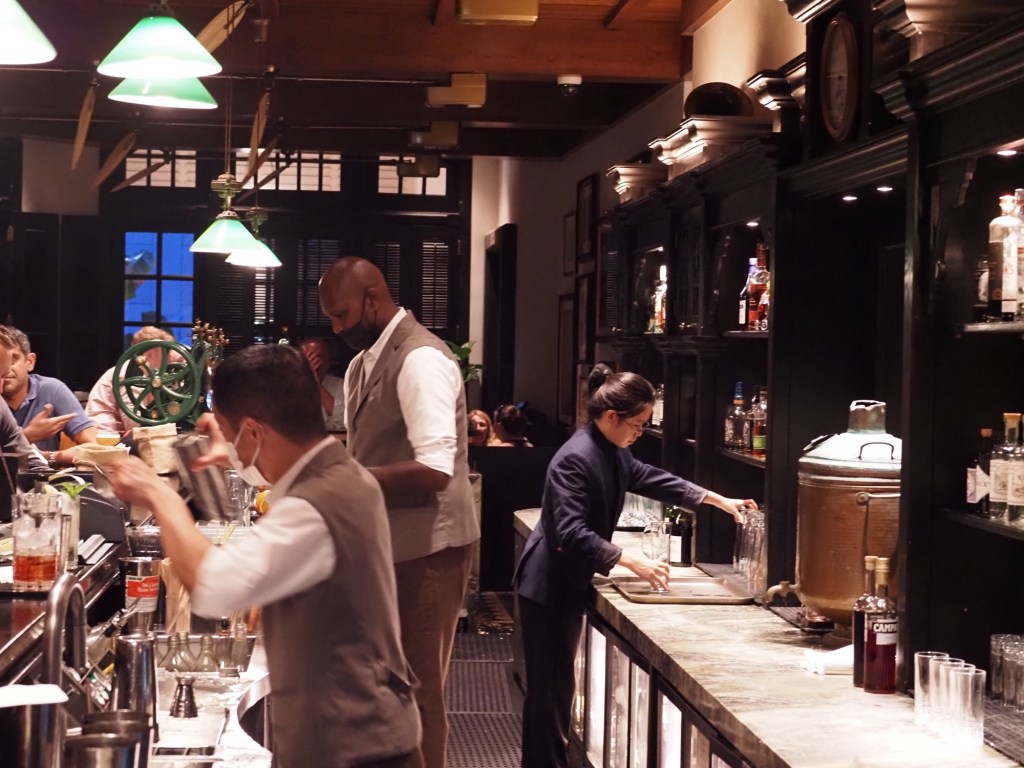 It is a short queue for a table at the Long Bar. So much history!