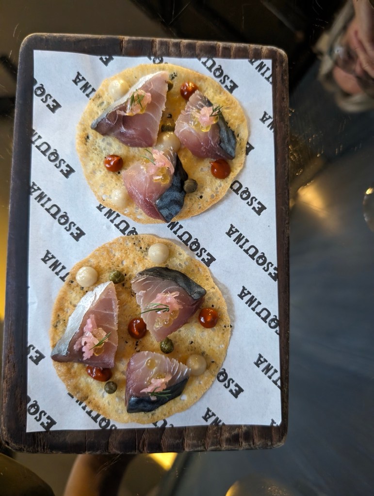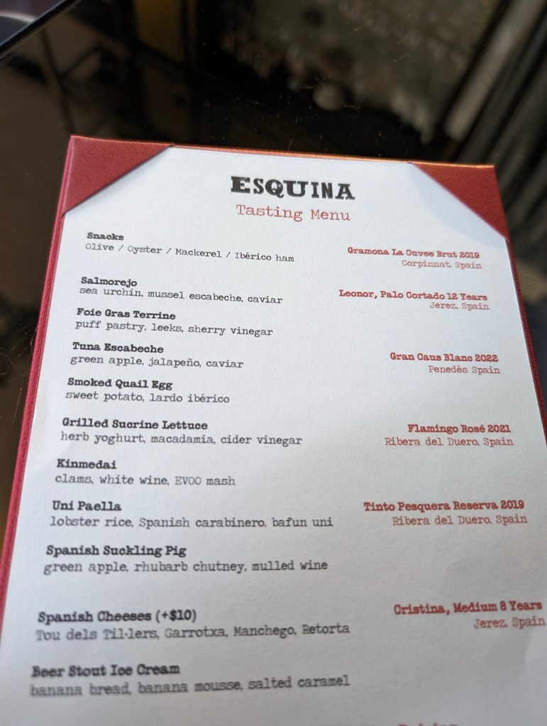We celebrate Pat’s birthday with dinner at Esquina-a Michelin star Spanish restaurant. Why not try the 10 course tasting menu.