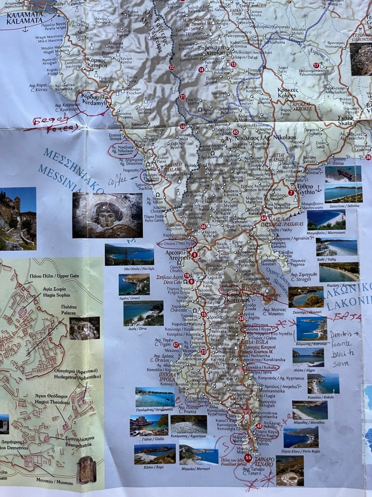 Our route – yesterday we drove down the western side of the Mani Peninsula. Today we will drive down the eastern side of the Mani Peninsula. Tomorrow we will drive north along the Bay of Messinia to Kalamata. Over the three days we will see all of Mani.