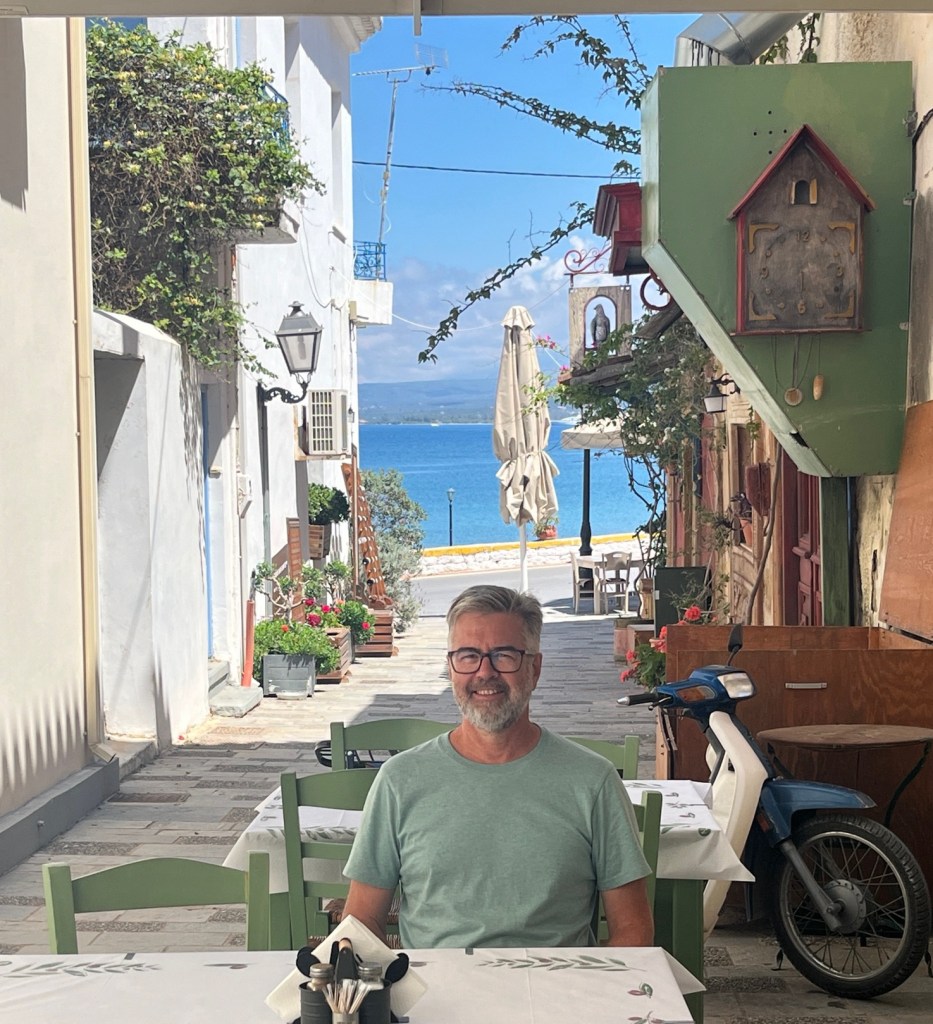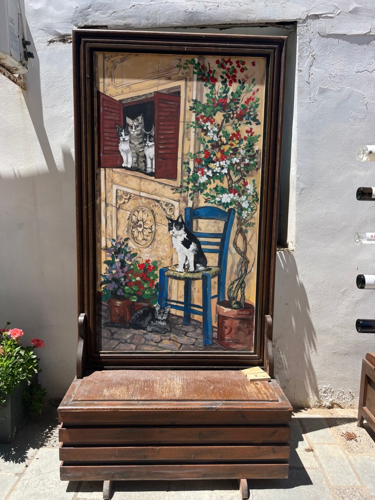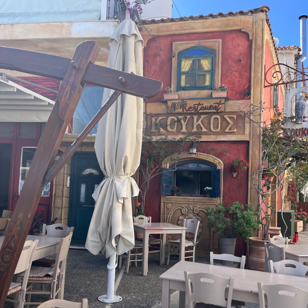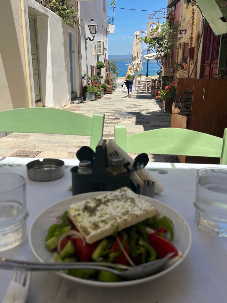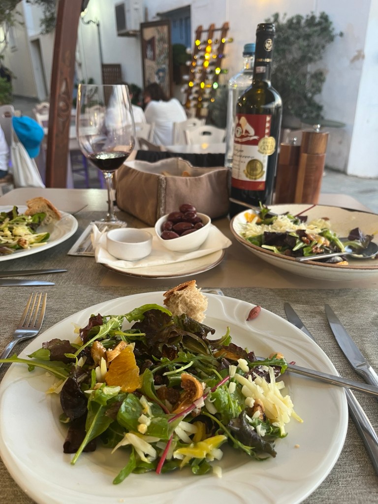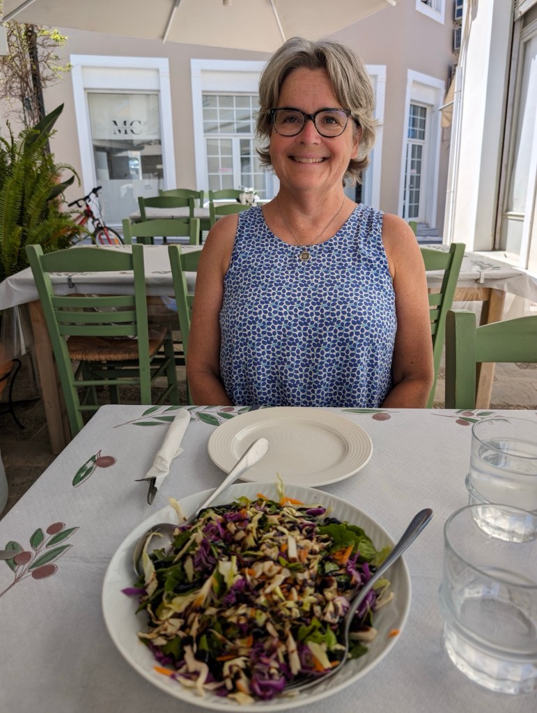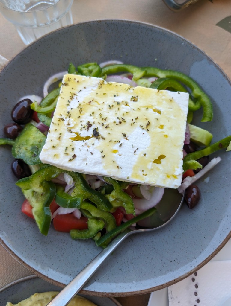 Over seven weeks in Greece we eat the Mediterranean diet. The meal choices come down to fish (many types and sizes and preparations) versus meat (grilled, braised, moussaka). I do not mind but Pat gets a little bored. We find splitting a main and a salad work well. We love sharing a big salad after rarely having this opportunity while in SE Asia.