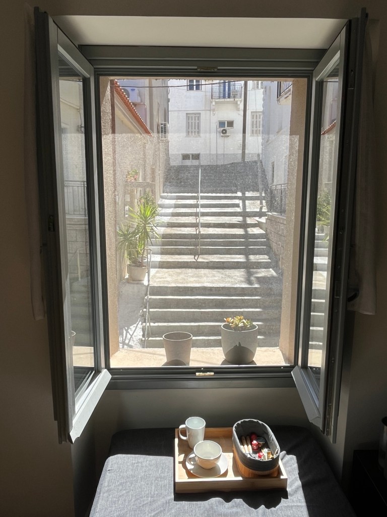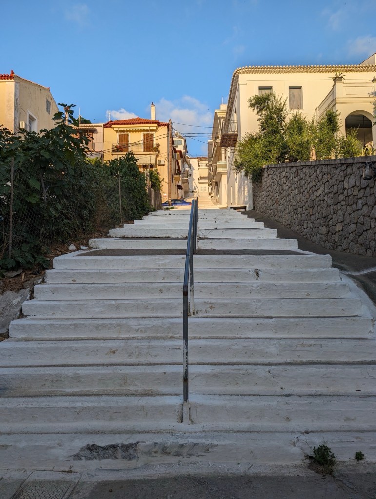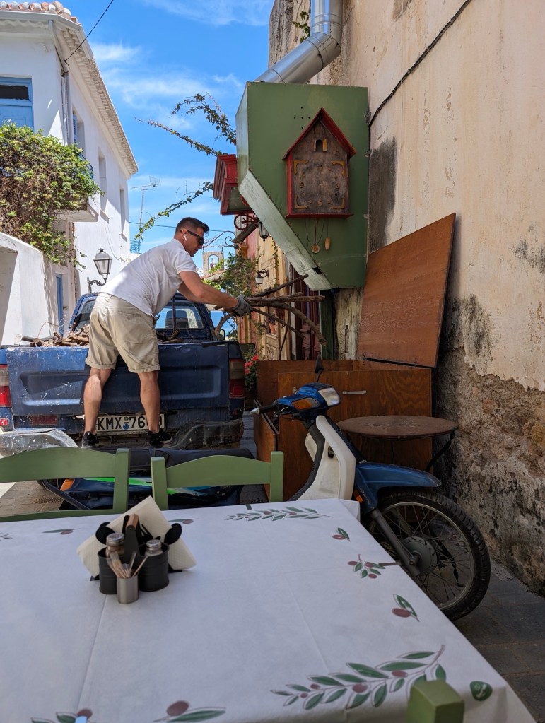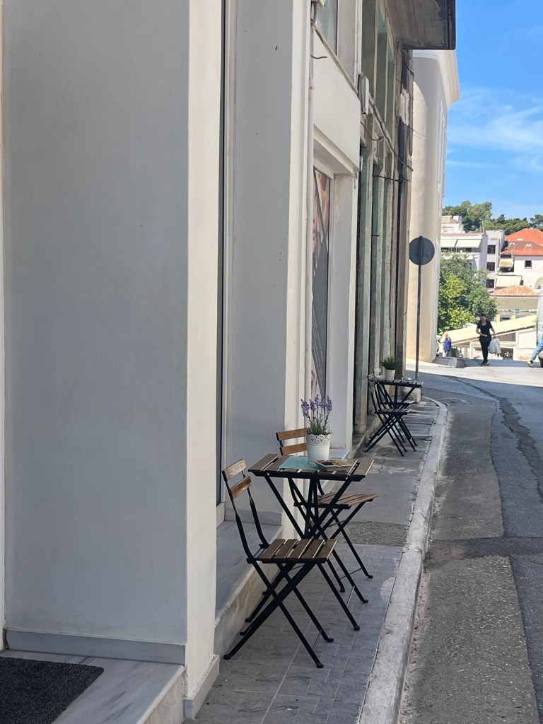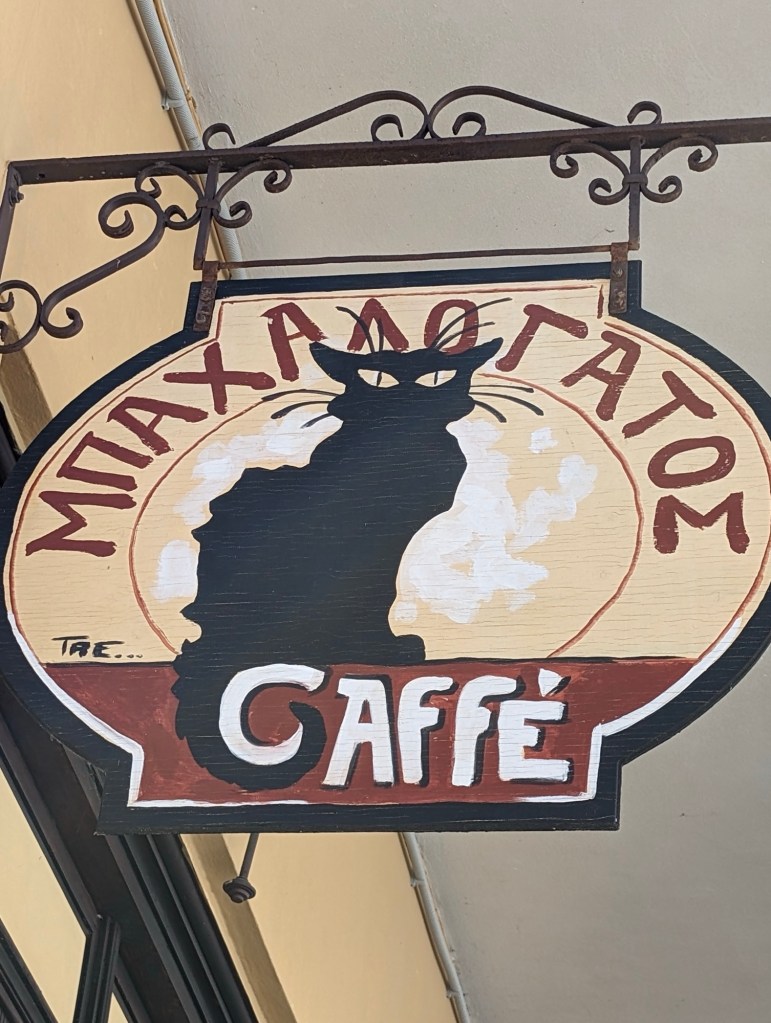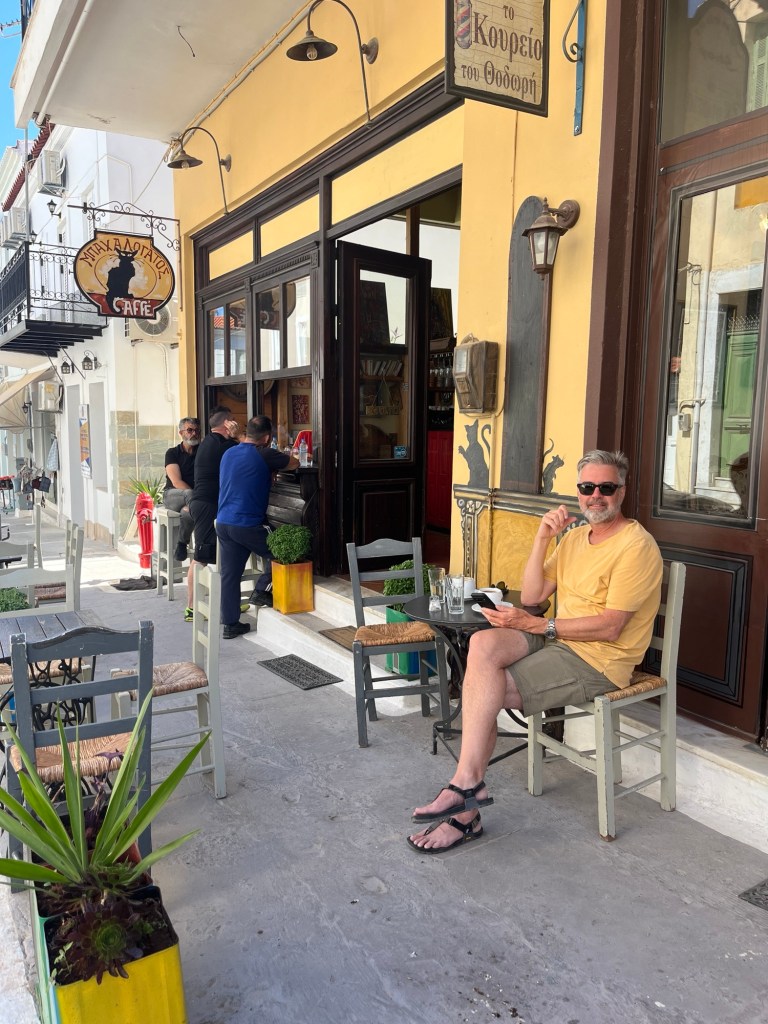 Then we wander up these stairs and turn left and down half a block to our fave coffee place MPAHALOGATOS CAFFE. During tourist season the caffe morphs into a bar later in the day: unfortunately it wasn’t tourist season just yet.