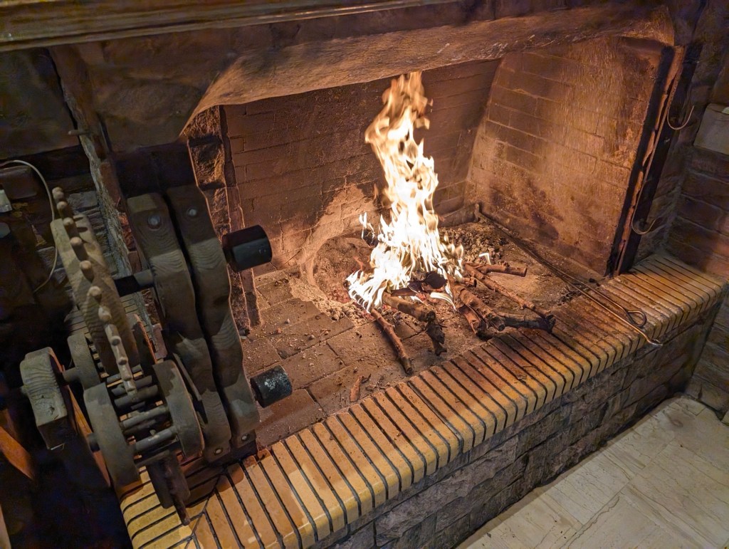 Pat checks out the olive wood fire. The process is that the wood is burned down to coals in the fireplace (see photo) and then the coals are transferred to the grill.