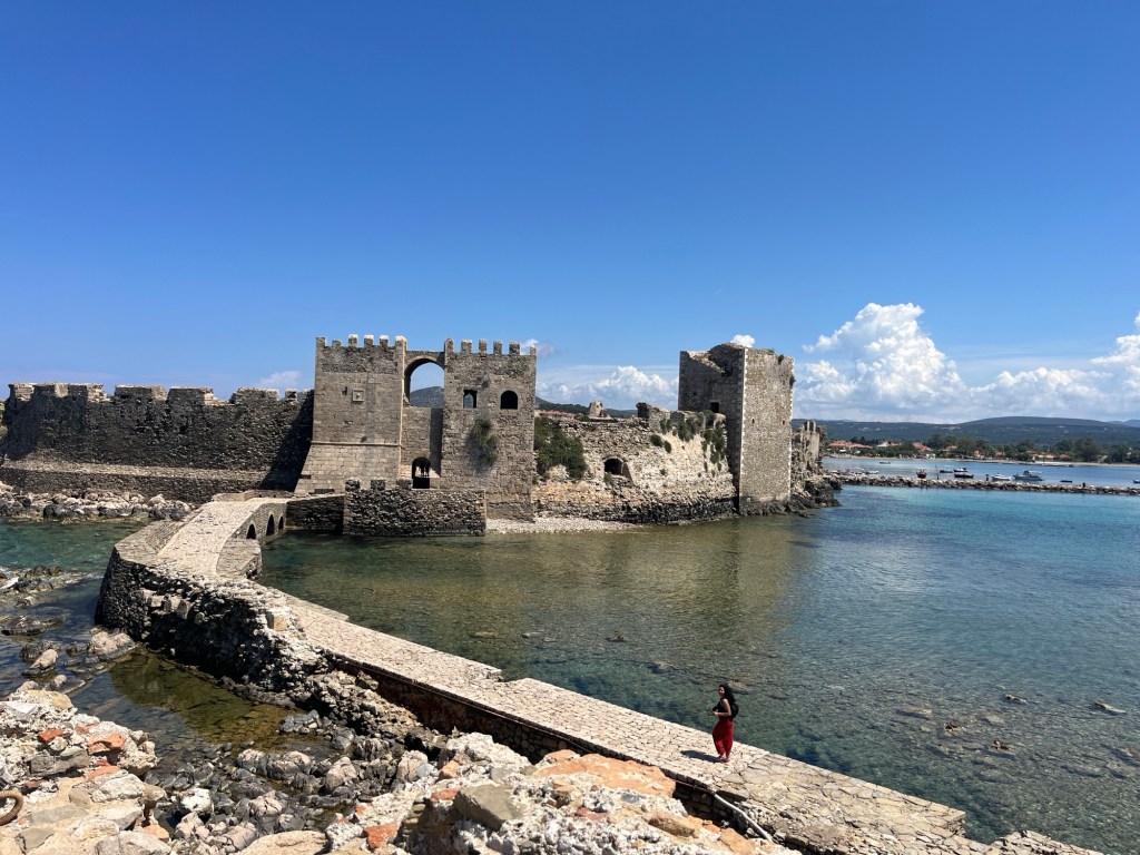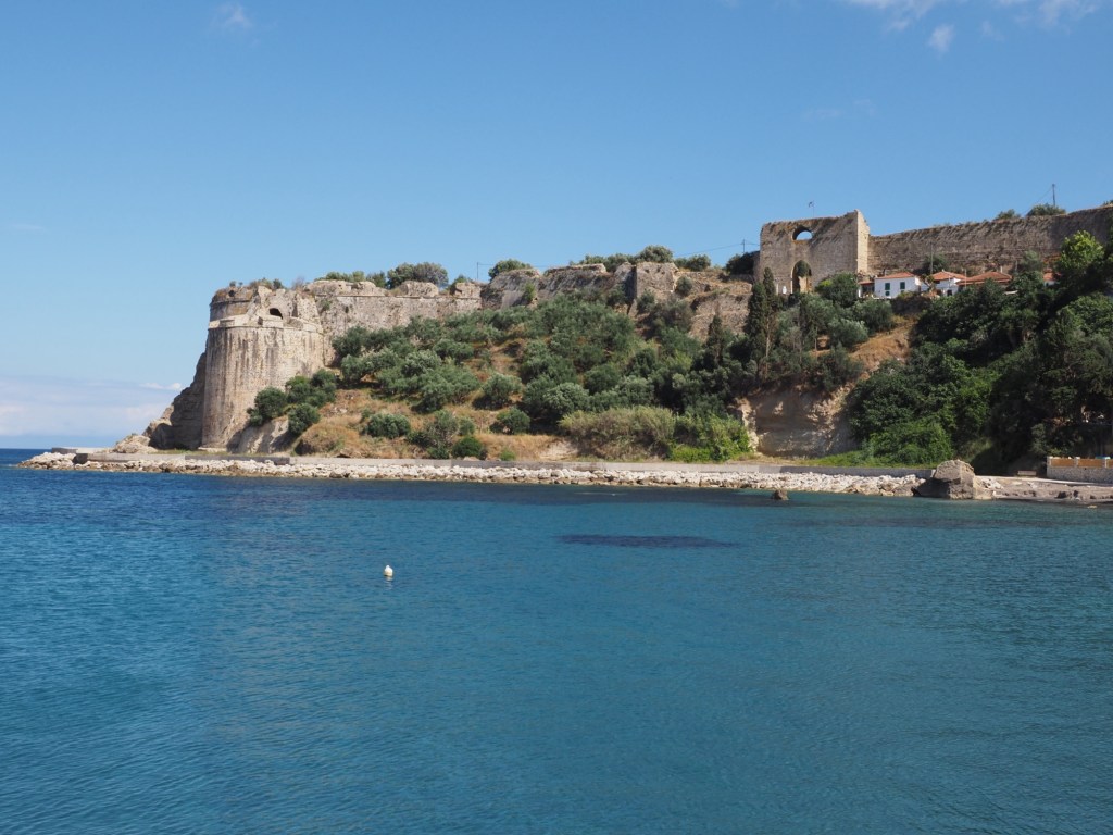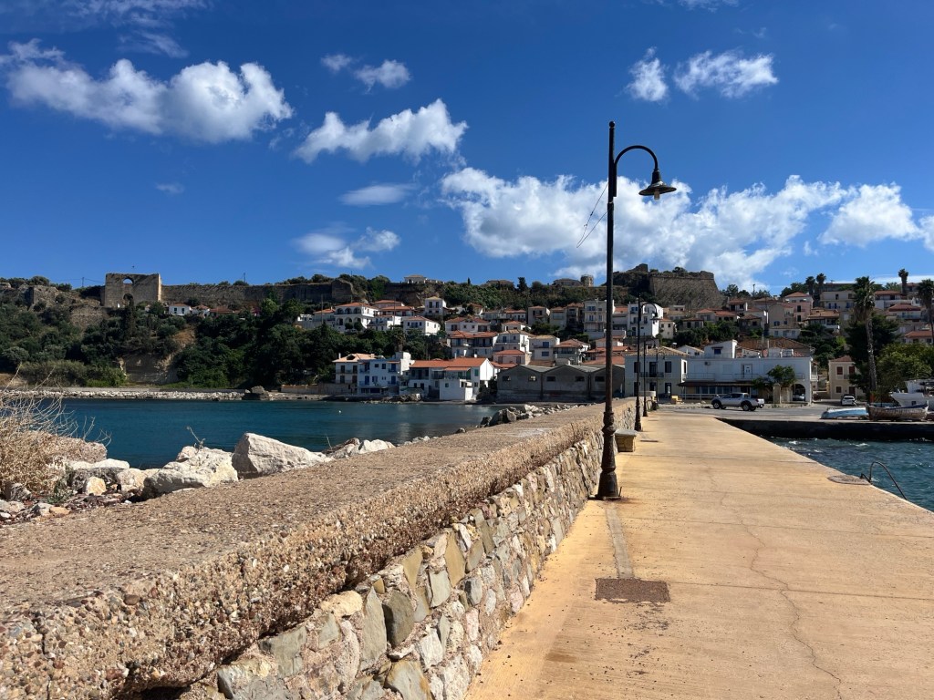 Walking north provides a panoramic view of the bay, port, and Pilos castle in the distance.