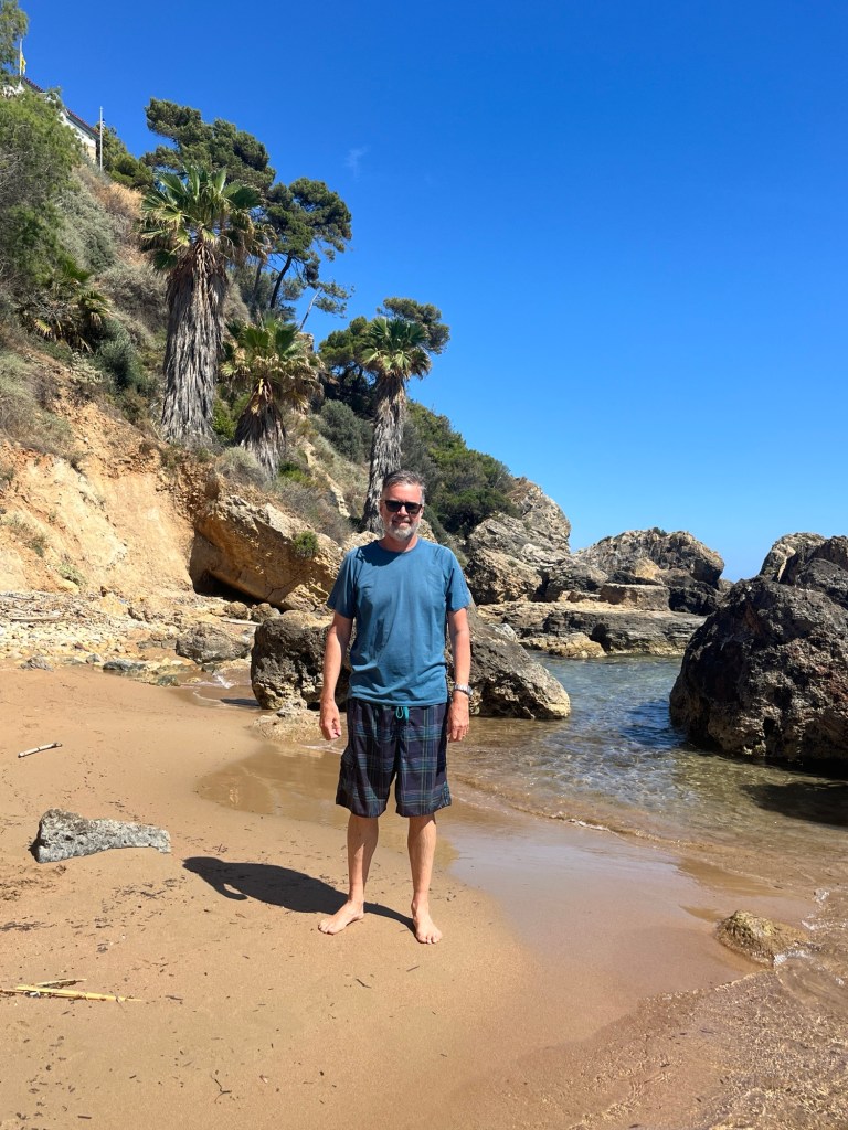 We find a small cove after climbing over some craggy rocks. Later we realize we can accomplish the same objective by wading in the water. Ha!