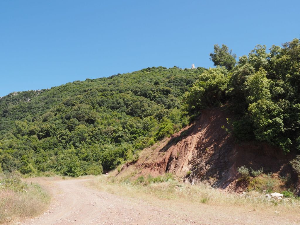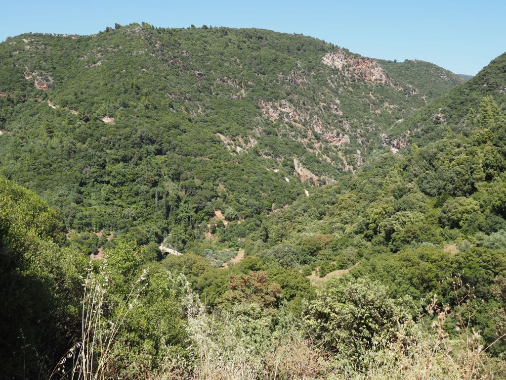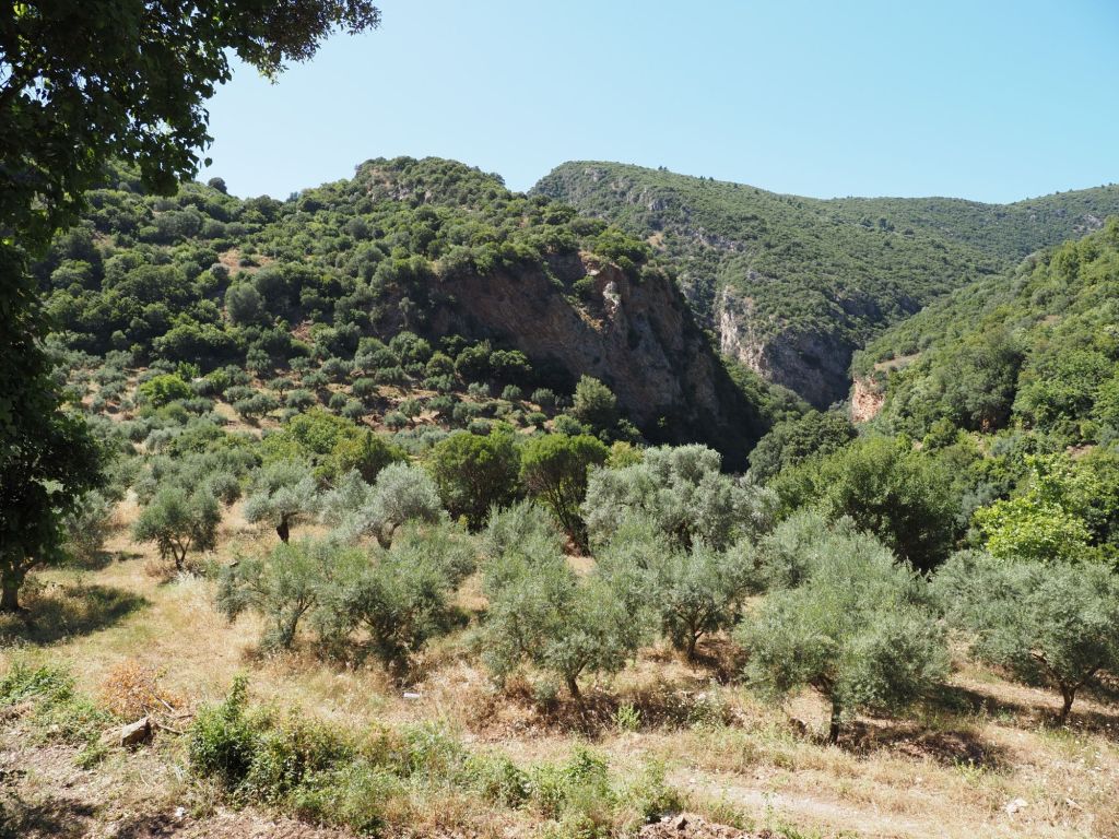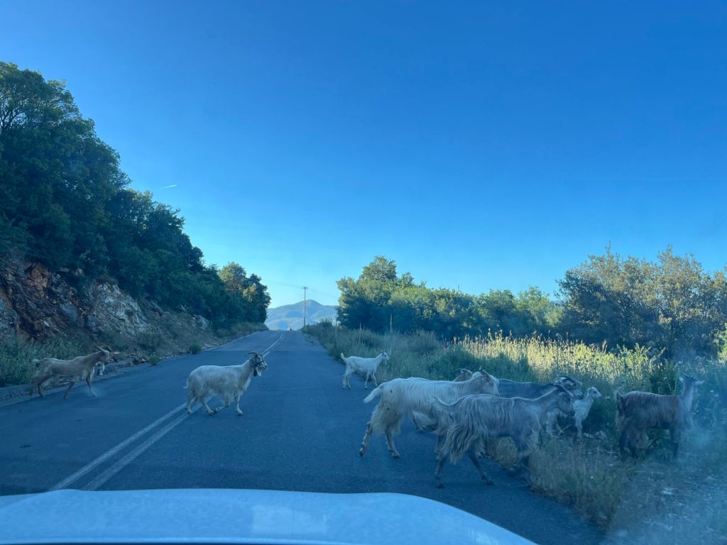 After passing through the town above – probably the narrowest and roughest streets we had seen – we followed Google Maps’ directions to Kakovatos. It took us through another small town, and past a bemused local who I saw shaking his head as we passed. The road quickly turned into a rocky goat track, so we turned around.  As we passed the local on the way back, I rolled down the window and we both had a laugh. He spoke no English, but motioned for us to turn left at the intersection ahead.  He pointed at the pavement and gave a thumbs-up. What followed was one of the nicest drives of the trip, through rolling hills and steep mountains mostly covered with olive groves. We even came across a herd of goats.