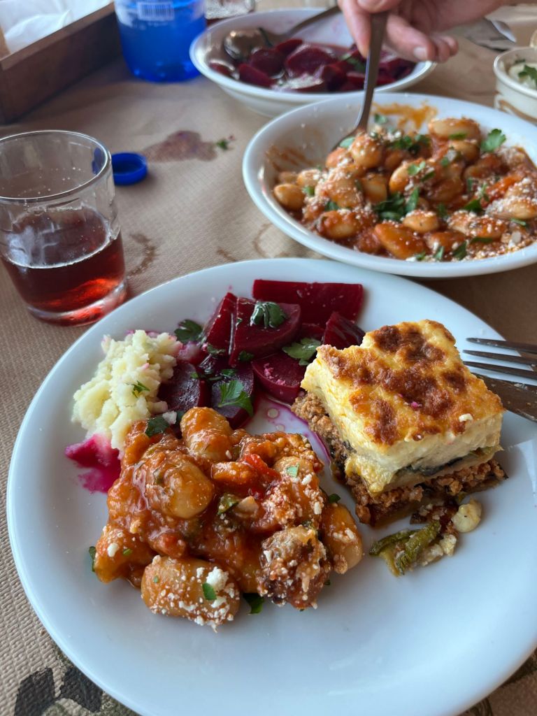 Beets with garlic sauce (a mixture of potatoes and loads of garlic), giant beans and Moussaka, plus half a kg of rosé.