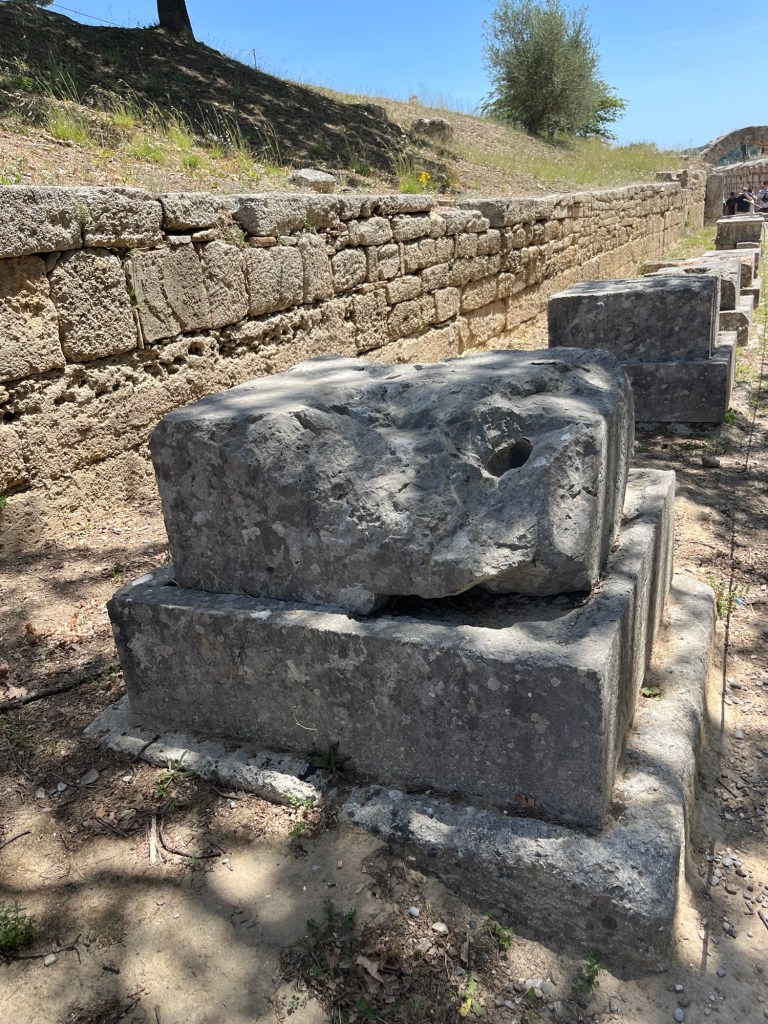 Before entering the stadium we walk along The Zanes. These are 16 bases. Back in the day, each base had a bronze statue of Zeus. Here is an interesting bit. There were fines levied against athletes who broke the code of conduct. The offender’s name and the infraction would be inscribed at the base of the statue. Infractions include bribery, lying, late arriving to the games and withdrawing from events.