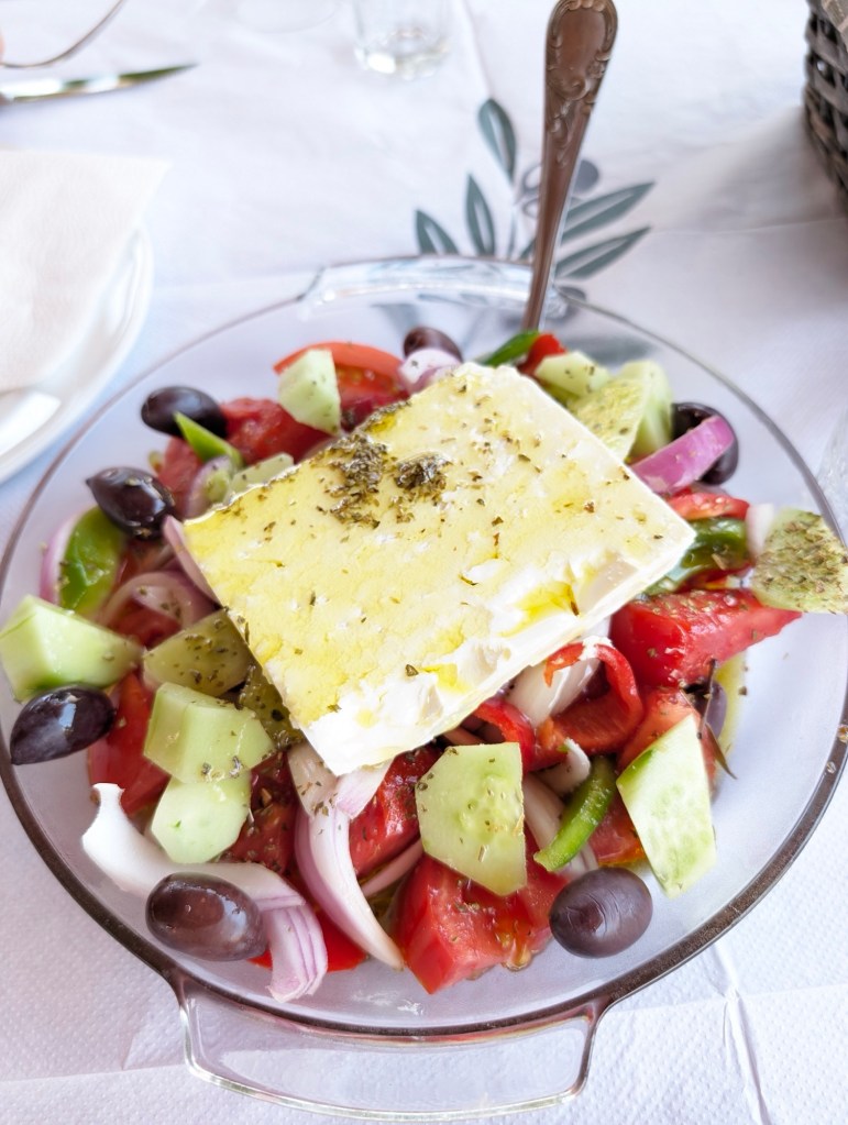 Greek salad with the biggest piece of feta cheese I have seen.